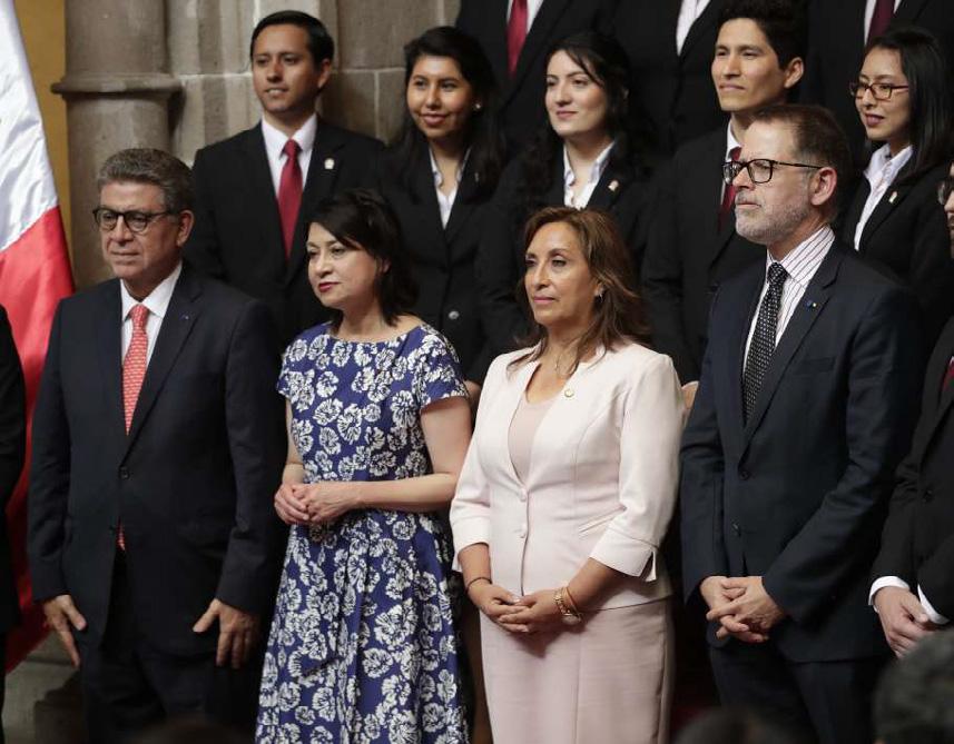 ACTO. La presidenta de Perú, Dina Boluarte Zegarra (c2), y la canciller de Perú, Ana Gervasi (c1).