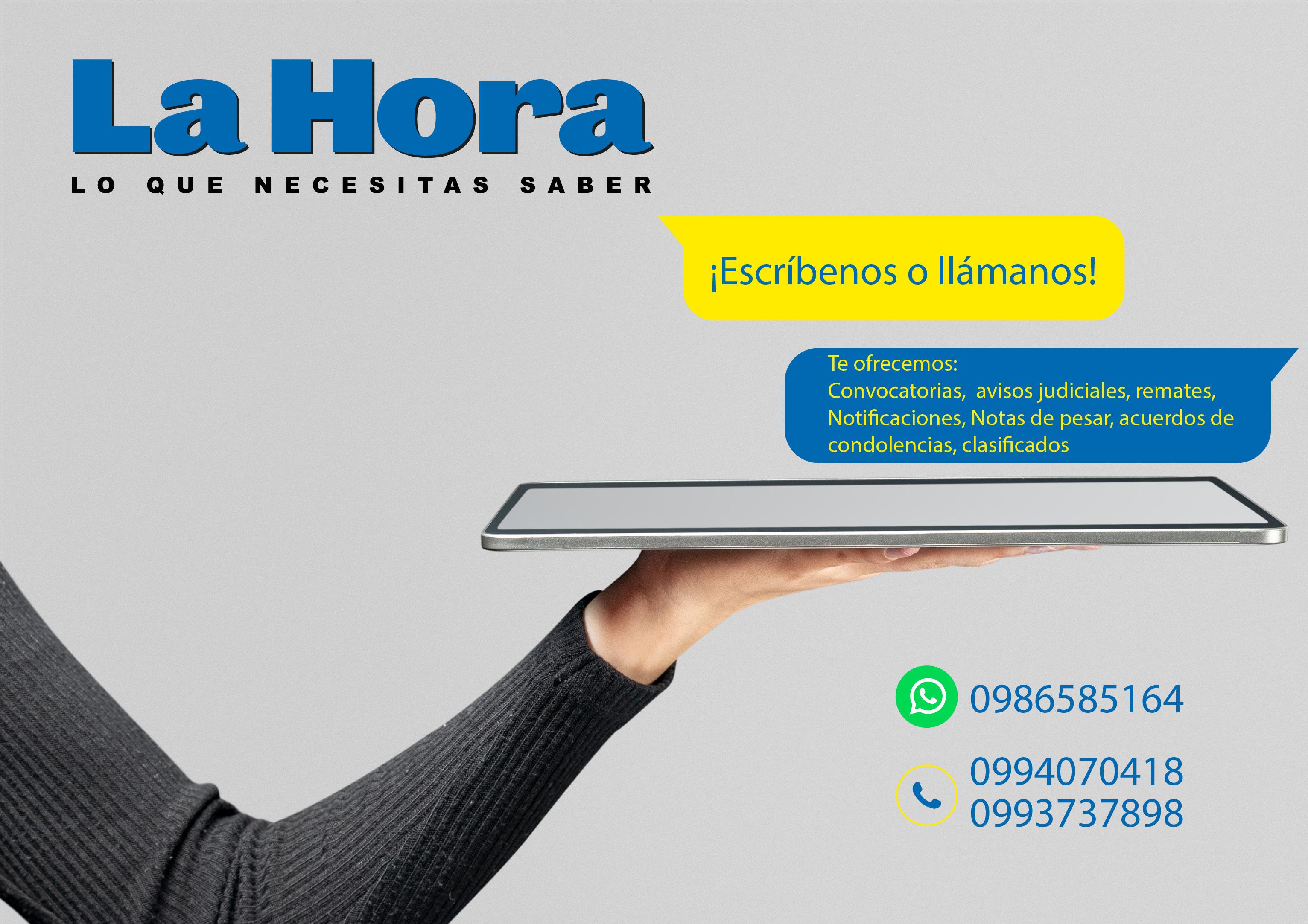 Nacional Gabriela Vivanco Salvador Editor General: Jean Cano Redacción: editorgeneral@lahora.com.ec Publicidad: publicidad@lahora.com.ec Año: XL No. 13575