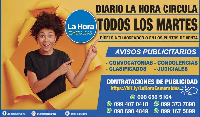 Medio de comunicación liberal, laico, agnóstico e inclusivo. Respetuoso y defensor de los Derechos Humanos, el Estado de Derecho y la Democracia. Directora Nacional Gabriela Vivanco Salvador Editor General: Jean Cano Editor Regional: Josué Navarrete Redacción: revistasemanal@lahora.com.ec Publicidad: fesmeraldas@lahora.com.ec Año: XXVIII No. 11752 Los escritos de los colaboradores solo comprometen a sus autores y no reflejan el pensamiento del medio, que se expresa en su Editorial. OPINIÓN 02 O ESMERALDAS JUEVES 11/MAYO/2023
