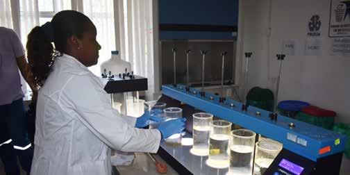 Carla Cevallos quien se desempeña como analista de laboratorio 2 en la planta de agua de la Emapse nos comenta de que se trata la prueba de jarras. “Esta prueba nos permite determinar la dosis óptima del policloruro de aluminio”