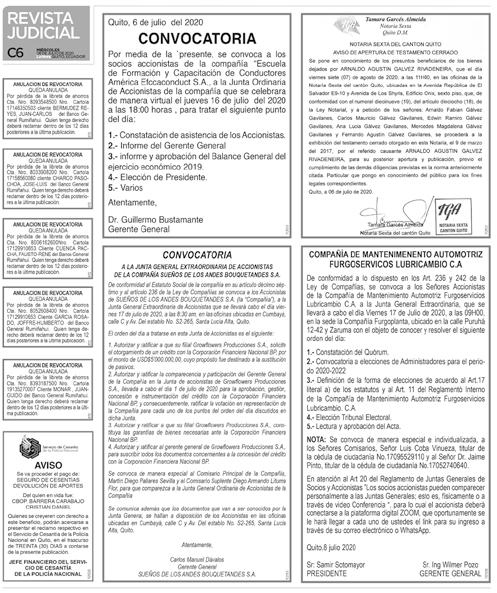 Se convoca de manera especial e individual al señor Gustavo Calvopiña Castillo Comisario Principal de la Compañía, domiciliado en las calles Eucaliptos N66-53 y Bartolomé Zamora del Distrito Metropolitano de Quito.