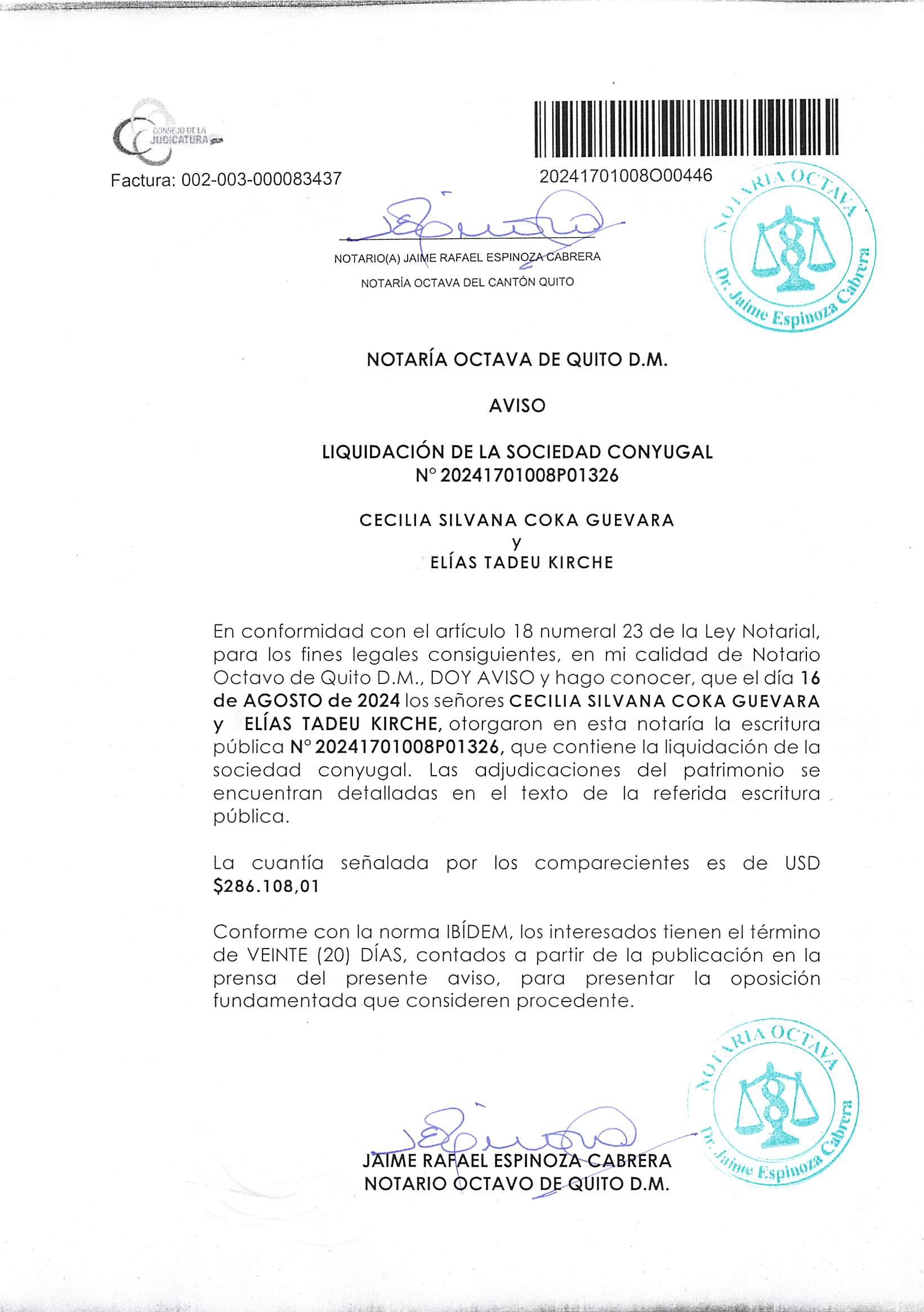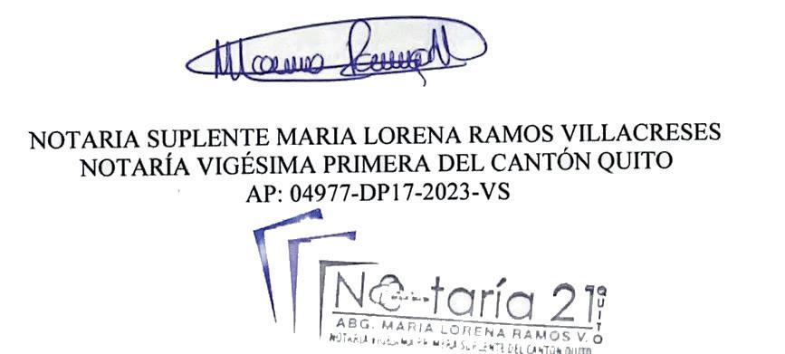 1. Mediante escritura pública otorgada el catorce de agosto del dos mil veinte y cuatro, ante mi Abogada Maria Lorena Ramos Villacreses, Notaria Vigésimo Primera del cantón Quito Suplente.