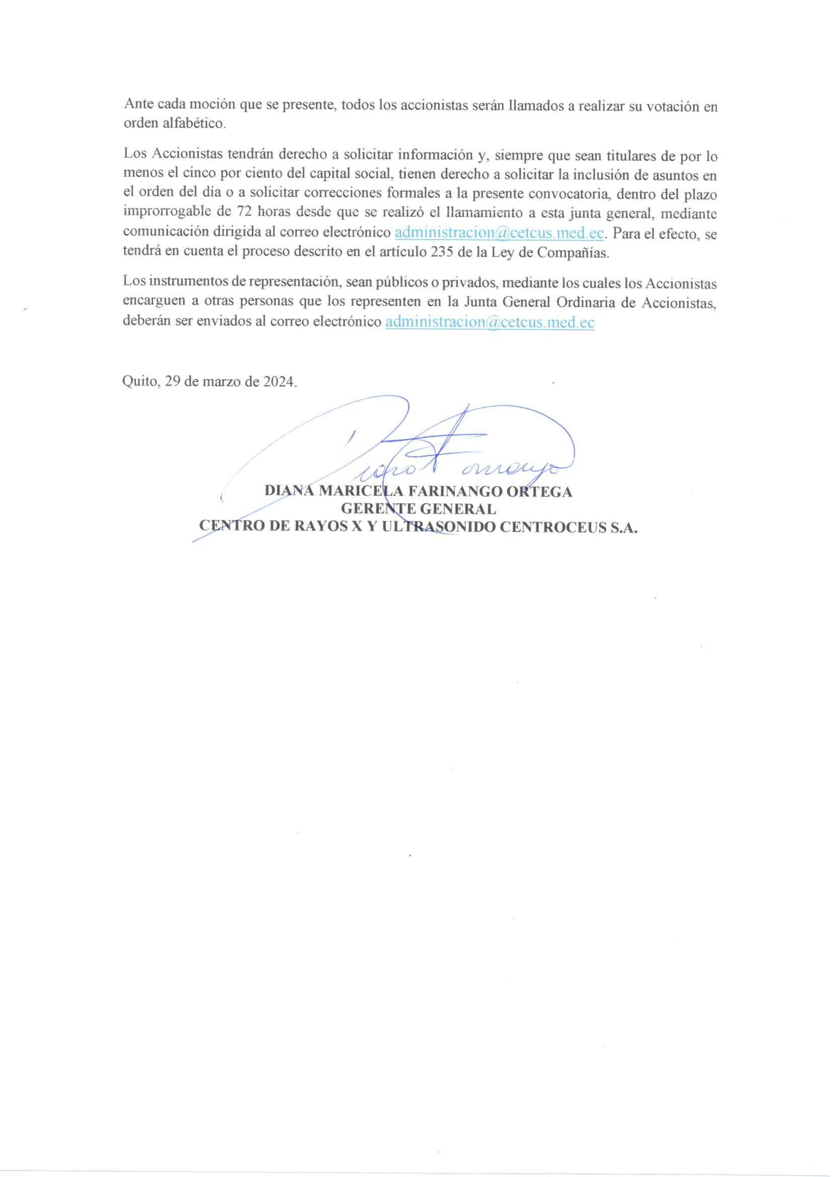 Los informes del Gerente General, del Comisario y del Auditor Externo, así como el balance general y estado de pérdidas y ganancias, correspondientes al ejercicio económico 2023, se encuentran a disposición de los señores accionistas en las oficinas de la Empresa, en la ciudad de Quito.