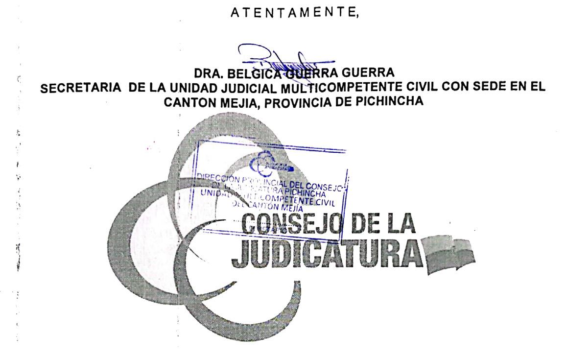 Lo que comunico a ustedes, para los fines legales consiguientes, previniéndoles de la obligación que tienen de señalar casillero judicial en la ciudad de Machachi, perteneciente al Cantón Mejía, Provincia de Pichincha, caso contrario serán tenidos o declarados en rebeldía.