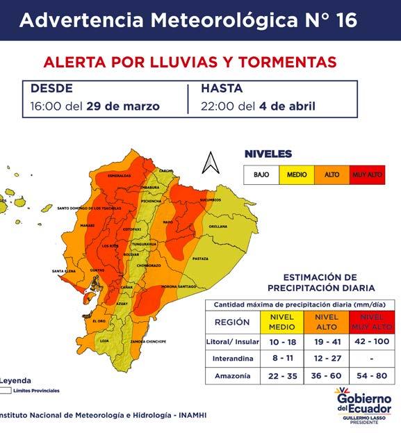alerta pronostica fuertes lluvias y los días con mayor intensidad fueron del 30 a 1 de abril , sin embargo se mantiene hasta el 4 de abril, en regiones interandina y amazónicas las previsiones son variables y de menor preocupación . Según el Instituto Nacional de Meteorología e Hidrología(Inamhi) es probable que exista acumulación de aguas en hogares, negocios y caminos susceptibles, las condiciones en las vías pueden ser afectadas.