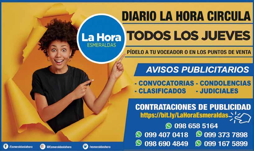 Medio de comunicación liberal, laico, agnóstico e inclusivo. Respetuoso y defensor de los Derechos Humanos, el Estado de Derecho y la Democracia. Directora Nacional Gabriela Vivanco Salvador Editor General: Jean Cano Editor Regional: Josué Navarrete Redacción: revistasemanal@lahora.com.ec Publicidad: fesmeraldas@lahora.com.ec Año: XXVIII No. 11760 Los escritos de los colaboradores solo comprometen a sus autores y no reflejan el pensamiento del medio, que se expresa en su Editorial. OPINIÓN 02 O ESMERALDAS MARTES 30/MAYO/2023