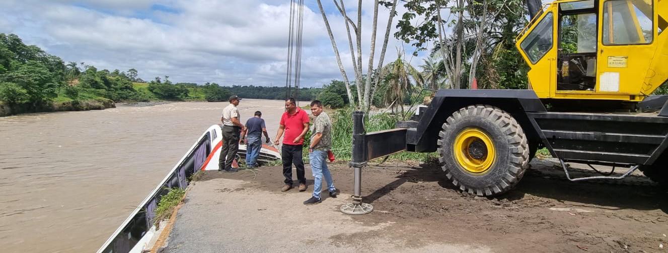 viajaban desde Esmeraldas a Manta - Manabi, terminaron con el vehículo parcialmente en el río, el cual se encuentra actualmente con un nivel bajo en su caudal, lo que evitó que el bus sea arrastrado por el agua, percance que pudo haber terminado en una desgracia con fallecidos.