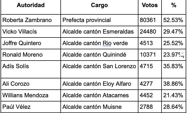 a Vicko Villacís. En el Cantón Río verde a Joffre Quintero Bolaños como Alcalde. En el Cantón Quinindé Ronald Moreno y Adís Solís como Alcaldesa del cantón San Lorenzo siendo ella la única mujer electa como alcaldesa en estas elecciones.
