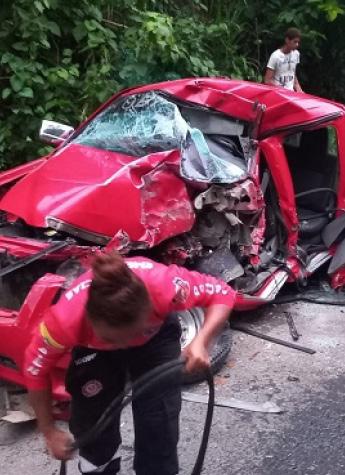 atrapado entre los fierros de la camioneta color roja, procediendo a realizar maniobras de descarcelación, sacando a la persona con vida. Asimismo, dos personas que iban en el