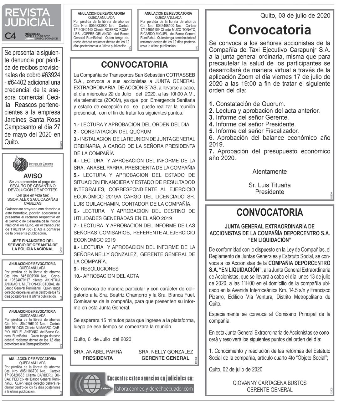 Se convoca de manera especial e individual al señor Juan Rosalindo Cando Rodríguez, Comisario Principal de la Compañía, domiciliado en la ciudad de Quito, parroquia Quitumbe, Av Lira Ñuzhca casa N° s36-74 del Distrito Metropolitano de Quito y al correo electrónico: soledfg@yahoo.com