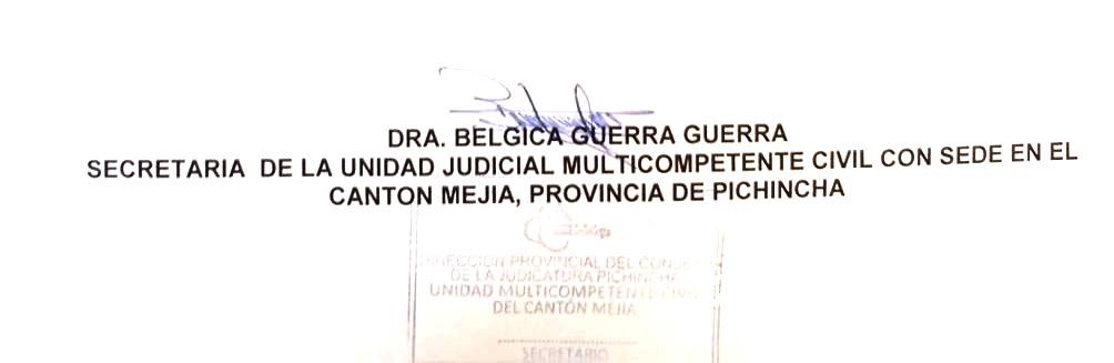 UNIDAD JUDICIAL MULTICOMPETENTE CIVIL CON SEDE EN EL CANTÓN MEJÍA, PROVINCIA DE PICHINCHA. Mejia, jueves 6 de abril del 2023, a las 14h31. VISTOS: Cumplida que ha sido la diligencia dispuesta por esta AUTORIDAD en auto inmediato anterior se considera: PRIMERO.- CALIFICACIÓN Y ADMISIÓN A TRÁMITE: En atención a lo consagrado en el artículo 169 de la Constitución, se la CALIFICA de completa, clara y cumple los requisitos legales generales contemplados en los artículos 142 y 143 del COGEP, situación por la cual se la ADMITE A TRÁMITE DE PROCEDIMIENTO ORDINARIO, establecido en el Libro IV, Título I, Capítulo I del Código citado, y en virtud de lo prescrito en el artículo 289 ibídem. SEGUNDO.- INSCRIPCIÓN.- Conforme a lo determinado en el inciso séptimo del Art. 146 del Código Orgánico General de Procesos (2019), inscríbase la demanda en el Registro de la Propiedad de este cantón, para lo cual confiérase el oficio respectivo dirigido al señor Registrador de la Propiedad del Cantón Mejía, a fin de que cumpla con lo dispuesto. TERCERO.- CITACIÓN: 3.1.- Al haber comparecido la accionante señora CUEVA CISNEROS MARIA INES, (fs. 45) ante esta JUZGADORA y al declarar bajo juramento lo siguiente: “…que les es imposible determinar la individualidad, el domicilio o residencia de los herederos desconocidos que tengan intereses en los bienes del señor MOISES JACINTO LEMA SANCHEZ, que ha efectuado todas las diligencias necesarias y ha acudido a los registros públicos de acceso, para tratar de ubicarlos…”; se dispone: De conformidad a los Art. 56 (2019); y, Art. 58 (2019) del Código Orgánico General de Procesos, CÍTESE a los herederos desconocidos de la causante señora MARIA LUISA MANCHENO MUÑOZ, por la prensa en uno de los diarios de mayor circulación que se edita en el Distrito Metropolitano de Quito, mediante tres publicaciones que se las realizara en fechas distintas. La parte accionante se acercarán a la Secretaría de esta Judicatura a retirar la documentación necesaria. 3.2.- CÍTESE con el contenido de la demanda y el presente auto al AB. ROBERTO CARLOS HIDALGO PINTO, en su calidad de ALCALDE DEL GAD MEJÍA y al DR. ADOLFO RAMIRO MAYORGA CÁRDENAS, en su calidad de PROCURADOR SÍNDICO DEL GAD MEJÍA, en el lugar señalado en la demanda, para lo cual remítase el suficiente despacho al señor Coordinador de la Oficina de Citaciones de esta Unidad Judicial. Al momento de citarse a la parte demandada se les prevendrá de su deber procesal de comparecer en esta causa, designar abogado patrocinador y señalar casilla judicial electrónica en este Distrito Judicial del cantón Mejía, para sus respectivas notificaciones. 3.3.- De conformidad a los Arts. 2, 3, 5 y 6 de la Ley Orgánica de la Procuraduría General del Estado, NOTIFÍQUESE al señor PROCURADOR GENERAL DEL ESTADO, para lo cual remítase ATENTO DEPRECATORIO VIRTUAL, a través del sistema implementado a uno de los señores Jueces de la UNIDAD JUDICIAL CIVIL CON SEDE EN LA PARROQUIA IÑAQUITO DEL DISTRITO METROPOLITANO DE QUITO, PROVINCIA DE PICHINCHA, ofreciéndole reciprocidad en casos análogos, para lo cual envíese el suficiente despacho. CUARTO: CONTESTACIÓN: Conforme lo establecido en el segundo inciso del 200313947-DFE artículo 291 del COGEP se concede a los demandados, el término de 30 días una vez citados, a fin de que contesten su demanda en la forma determinada en los artículos 151 del Código Orgánico General de Procesos (2019) y siguientes del COGEP, salvo aplicación de la disposición contemplada en el artículo 157 (2019) ibídem, de ser el caso. QUINTO.- ANUNCIO DE PRUEBA: Considérese el anuncio de prueba señalados en el libelo de demanda, en la parte pertinente a su anuncio de prueba; circunstancia que se estará a lo previsto en los artículos 160 (2019), 161, 294.7 literal d), del COGEP, sobre la admisibilidad y practica de prueba en la respectiva Audiencia Preliminar. Al tenor de lo dispuesto en el artículo 169 tercer inciso (2019) Ibídem, se ordena a las partes que pongan a disposición de la respectiva contraparte las pruebas que estén o deban estar en su poder. SEXTO.- NOTIFICACIONES Y AUTORIZACIÓN: Téngase en cuenta el casillero judicial electrónico señalado por la parte accionante para posteriores notificaciones; así como la autorización conferida a su defensa técnica. Agréguese al expediente la documentación adjunta por la parte actora. Actúe la Dra. Bélgica Guerra Guerra, en calidad de Secretaria Titular de esta Unidad Judicial Multicompetente Civil. NOTIFÍQUESE.- F). DRA.WILMA GUAIPATIN GARZON – JUEZA. UNIDAD JUDICIAL MULTICOMPETENTE CIVIL CON SEDE EN EL CANTÓN MEJÍA, PROVINCIA DE PICHINCHA. Mejia, martes 20 de junio del 2023, a las 16h05. VISTOS: Agréguense al proceso los escritos presentados por la señora MARIA INES CUEVA CISNERROS-. En lo principal se dispone: A fin de evitar nulidades procesales, cumplir con el debido proceso y el derecho a la defensa, con fundamento en lo que dispone el Art. 169 de la Constitución y Art. 130 numeral 8 del Código Orgánico de la Función Judicial, se convalida el auto de fecha 6 de abril del 2023, a las 14h31, ya que por un lapsus calami erróneamente se en la parte pertinente se ha hecho constar lo siguiente; “…que les es imposible determinar la individualidad, el domicilio o residencia de los herederos desconocidos que tengan intereses en los bienes del señor MOISES JACINTO LEMA SANCHEZ, que ha efectuado todas las diligencias necesarias y ha acudido a los registros públicos de acceso, para tratar de ubicarlos…”; siendo lo correcto: ““…que les es imposible determinar la individualidad, el domicilio o residencia de los herederos desconocidos que tengan intereses en los bienes del señor MARIA LUISA MANCHENO MUÑOZ, que ha efectuado todas las diligencias necesarias y ha acudido a los registros públicos de acceso, para tratar de ubicarlos…”; por lo que se rectifica en este sentido par