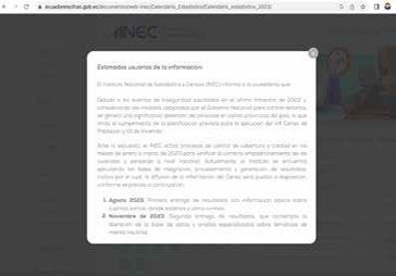 Al consultar al INEC, la respuesta fue que en los próximos días invitarán a los medios a la presentación de resultados. Sin embargo, en la web de esta entidad hay un aviso que dice que los datos estarían entre agosto y noviembre de 2023. (ver foto)