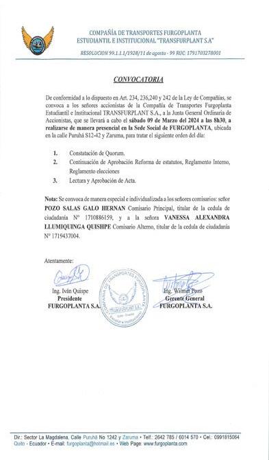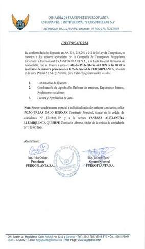 De acuerdo a lo previsto en la ley de Compañías y en los Estatutos Sociales vigentes, se convoca con carácter de obligatorio a todos los señores y señoras Accionistas de la Compañía Translider S.A., a la Junta General Ordinaria que tendrá lugar el día Miércoles