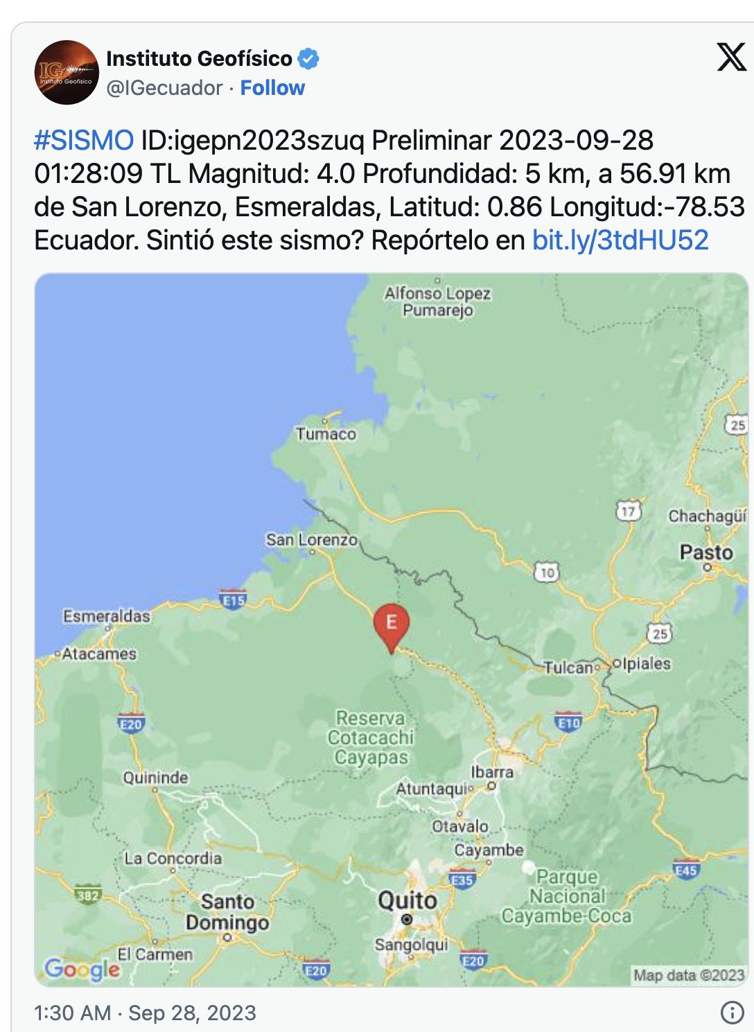 La madrugada del 28 de septiembre fue particularmente agitada para los habitantes de Esmeraldas e Imbabura. Tres sismos de intensidades variadas sacudieron estas provincias, causando inquietud entre la población.