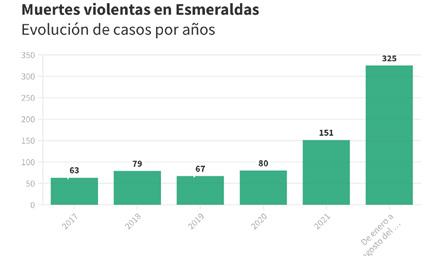 En el año 2020 Esmeraldas registró 80 muertes violentas en comparación a las 511 muertes violentas del 2022 representa casi 7 veces las víctimas de homicidios.