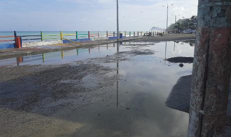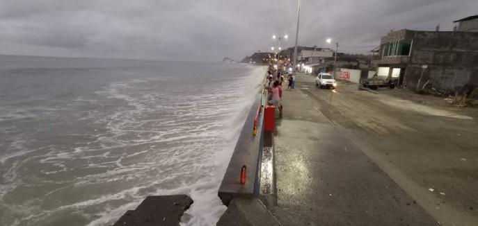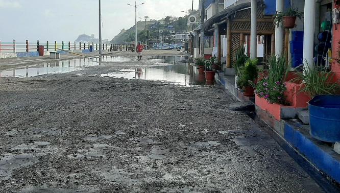 En el área del denominado malecón escénico, a ratos desbordaban las aguas e ingresaban hasta la arteria, las mismas que, en la mayoría de las ocasiones, corrían hacia los ductos de drenajes que les retornan a la playa y, en otros momentos, alcanzaban a adentrarse hacia la población por la calle Francisco Torres Contreras recorriendo, al menos, dos cuadras.