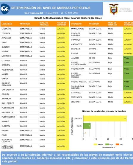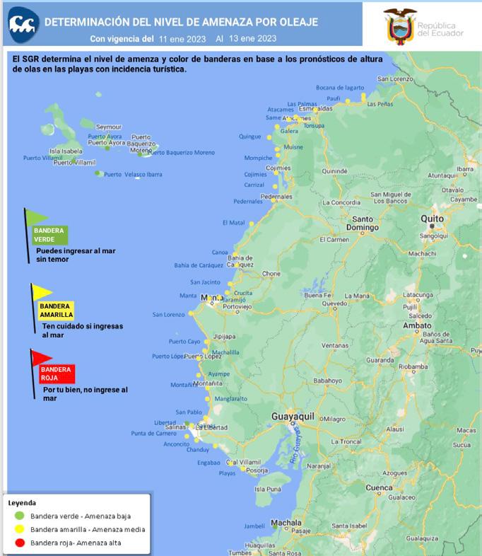 No obstante, el indicado boletín advertía que, sin embargo, se espera que, a partir del domingo 15 de enero de 2023 , arribe a las costas de nuestro país un nuevo tren de olas con similares características, cuyos efectos se sentirán en las Islas Galápagos el lunes 16 de enero; y, en la costa continental de nuestro país, a partir del martes 17 de enero del presente año.