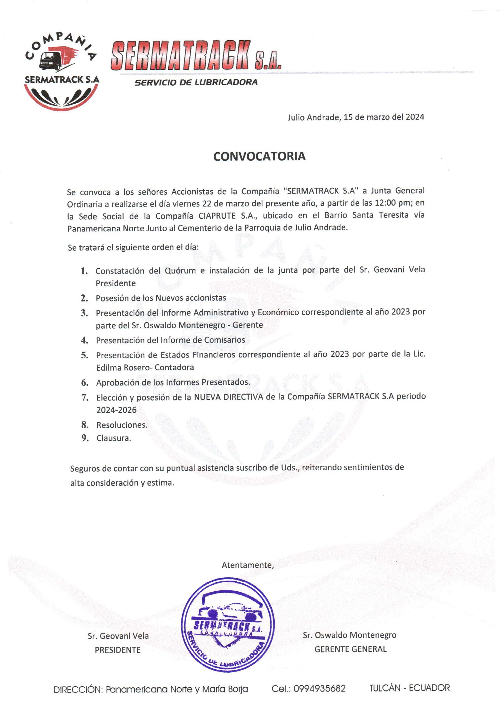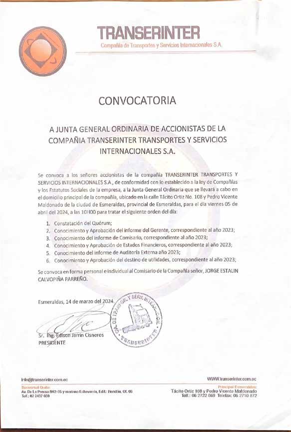 Se reitera que considerando el Artículo 292 de la Ley de Compañías1 que los balances, estados financieros, informes de comisario y de gerente general del año 2023, se encuentran a disposición de los señores accionistas para su revisión en la oficina de la compañía ubicada en (el Pasaje S26A Oe3 290 y Avenida Rumichaca) Parroquia de Turubamba, Provincia de Pichincha. Se deja expresa constancia que los documentos señalados, se exhiben en la dirección antes indicada con cinco (5) días de anticipación a la celebración de la junta general convocada. No obstante de aquello, en aplicación del inciso segundo y tercero del Art. 292 de la Ley de Compañías, se procede a notificar con esta convocaria con la información antes mencionada, pudiendo además revisarla de manera directa en las oficinas de la compañía. Siendo obligación de los accionistas el guardar el sigilio respectivo.