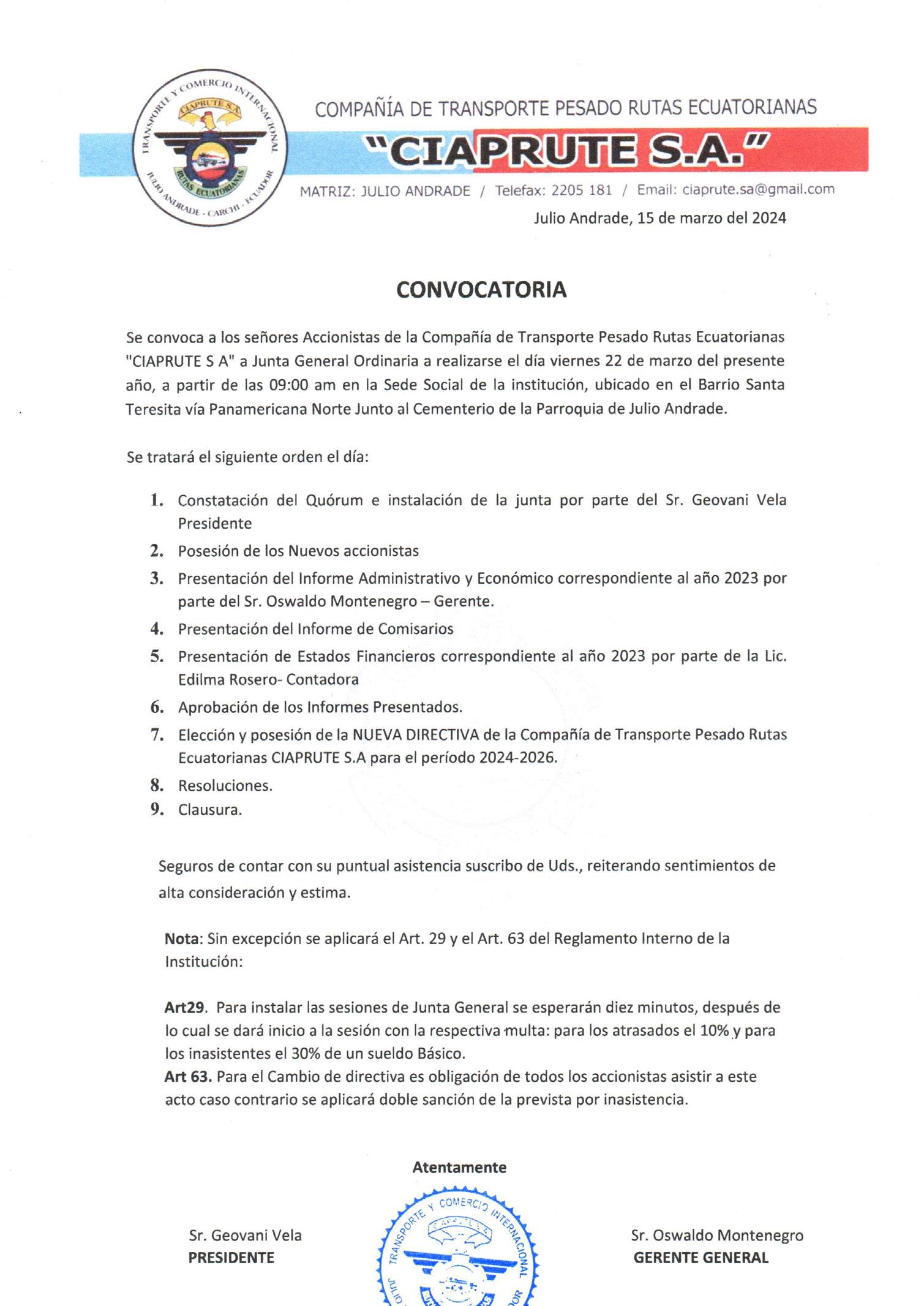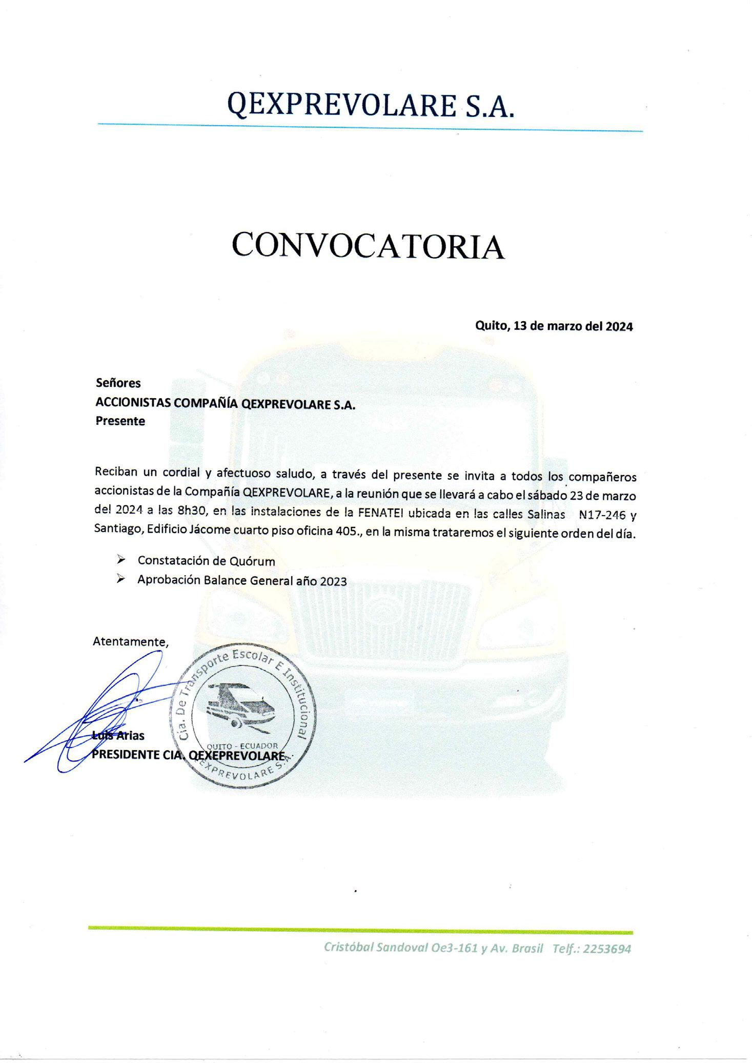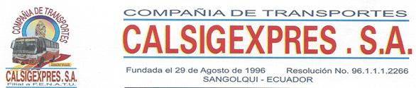 De acuerdo al Art. 235 de la Ley de Compañías, se convoca a JUNTA GENERAL EXTRAORDINARIA DE ACCIONISTAS DE LA COMPAÑÍA DE TRANSPORTES CALSIGEXPRES S.A. a realizarse el día lunes 25 de marzo del 2024, a las 09h00 am (NUEVE DE LA MAÑANA) en la Sede Social de la Compañía, Ubicada en el Barrio San Fernando, Calle Libertadores Lucas Tipán, a una cuadra antes del IASA, de la Ciudad de Sangolquí, Cantón Rumiñahui, de acuerdo al artículo 236 de la Ley de Compañías para conocer y resolver sobre el siguiente Orden del Día.
