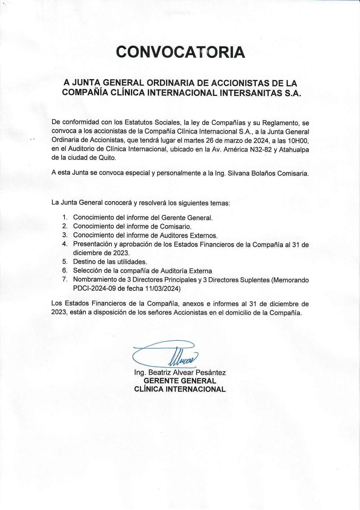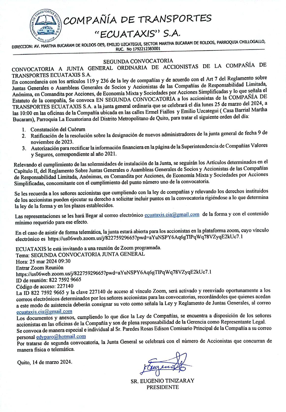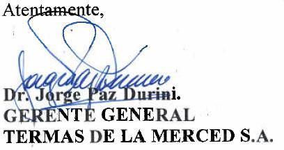 De conformidad con lo dispuesto en la Ley de Compañías y con el estatuto social de la Compañía se convoca a los accionistas de Termas de la Merced S.A., a la Junta General Ordinaria de Accionistas que se llevará a cabo el día, jueves 28 de marzo de 2024 a las 12h00, por vía telemática.