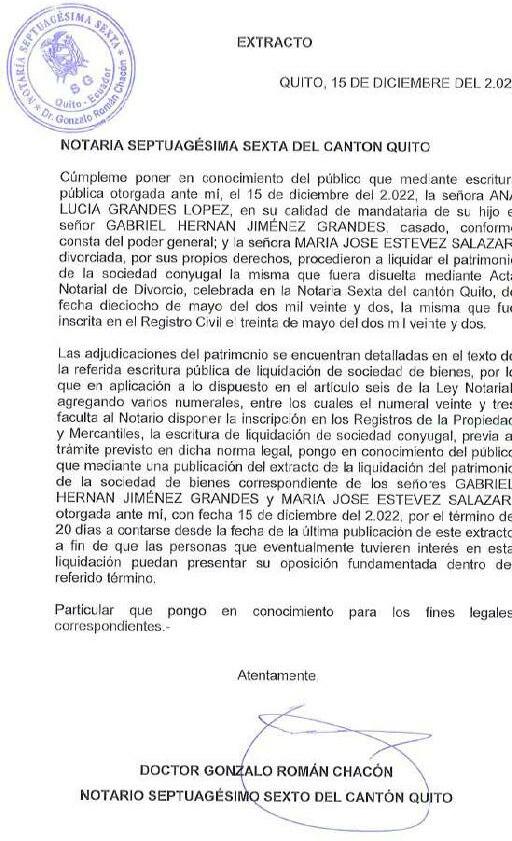 Cúmpleme poner en conocimiento del público que mediante es critura pública otorgada ante mí, el 15 de diciembre del 2.022, la taria de su hijo el señor GABRIEL HERNAN JIMÉNEZ GRANDES, casado, conforme consta del poder general; y la señora MARIA JOSE ESTEVEZ SALAZAR, divorciada, por sus propios derechos, procedieron a liquidar el patrimonio de la sociedad conyugal la ebrada en la Notaría Sexta del cantón Quito, de fecha dieciocho de mayo del dos mil veinte y dos, la misma que fue inscrita en el