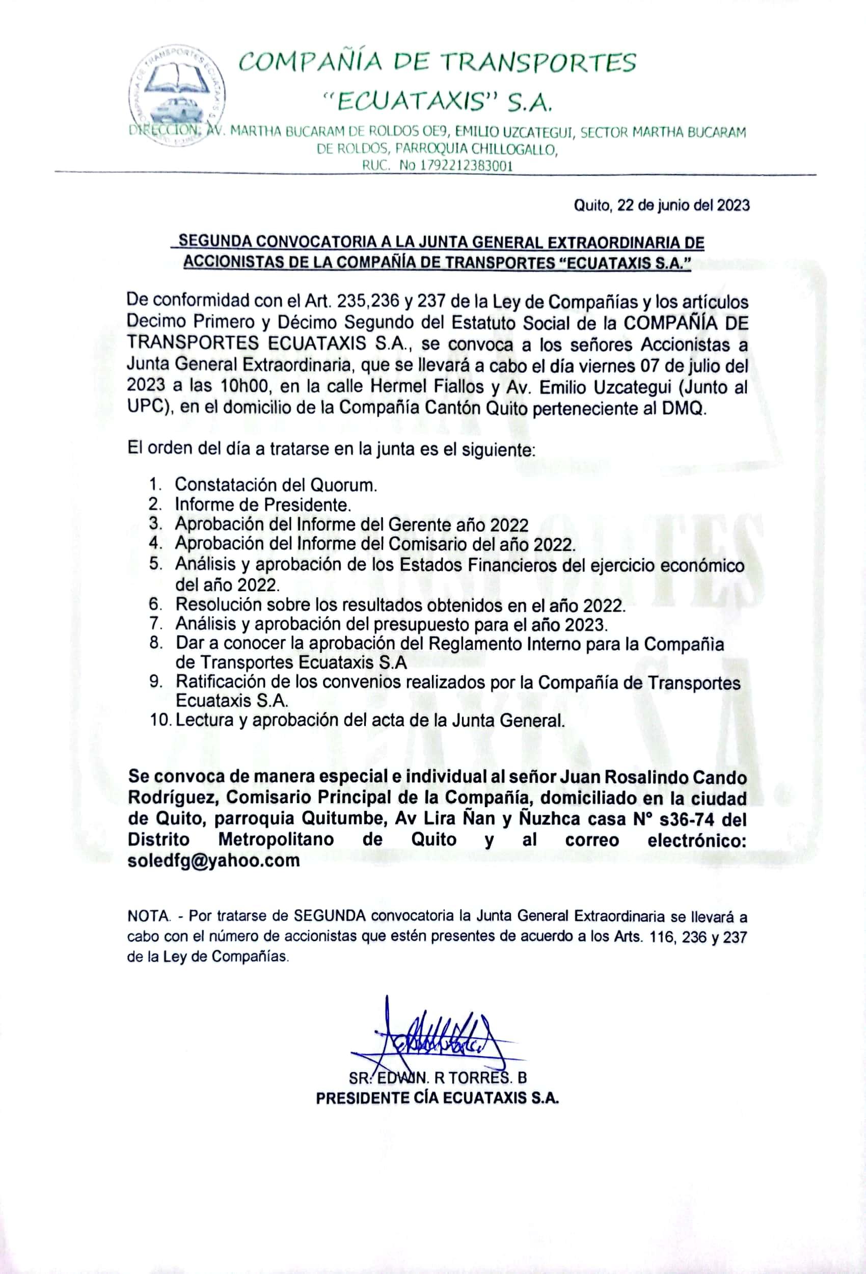 De conformidad a los artículos 12, 13, 14, 15, 16 y 17 del estatuto social y de los artículos 231, 235, 236, 237 de la ley de compañías y su reglamento se convoca a los accionistas de TAXIFENIX ONLINE S.A. a la Junta General Ordinaria que se llevara a cabo el día MIERCOLES 05 DE JULIO 2023 a las 14:00 pm, en el domicilio de la compañía ubicada en las calles Buenos Aires OE5114 y Estados Unidos en la ciudad de Quito provincia de Pichincha parroquia San Juan, para tratar los siguientes puntos del orden del día