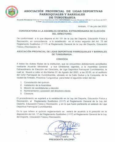 Se convoca a los socios del Club Deportivo Básico Barrial “GREMIO”, a la asamblea general extraordinaria, de elecciones (periodo 2023-2027) que se realizará el día 1 de Agosto de 2023 a las 19h00.