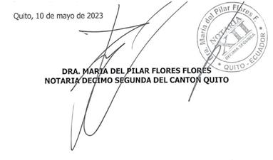 A fin de proceder a su aprobación, pongo en conocimiento del público en general, el extracto de la escritura pública número 20231701012P01056, otorgada ante mí, Doctora María del Pilar Flores Flores, Notaria Décima Segunda del Cantón Quito, el diez de mayo de dos mil veintitrés, en la cual se Constituyó la Sociedad Civil Anónima COMPAÑÍA RELIER, cuyas características son las siguientes: