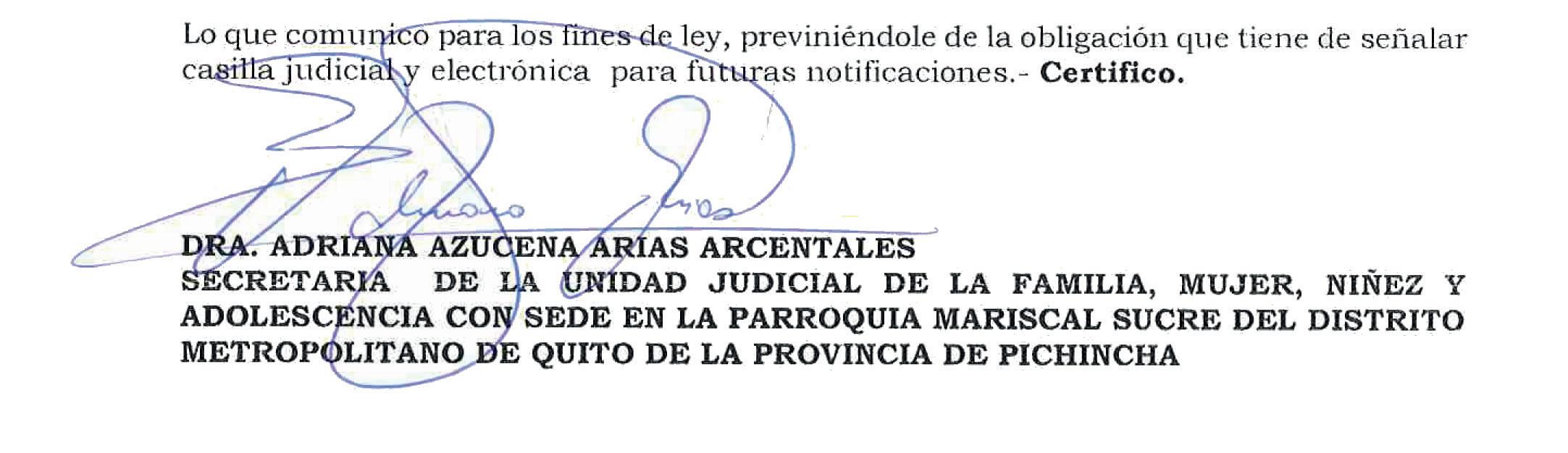 UNIDAD JUDICIAL DE FAMILIA, MUJER, NIÑEZ y ADOLESCENCIA CON SEDE EN LA PARROQUIA MARISCAL SUCRE DEL DISTRITO METROPOLITANO DE QUITO, PROVINCIA DE PICHINCHA. Quito, jueves 5 de enero del 2023, a las 10h21. VISTOS: Agréguese a los autos, el escrito que antecede. Ab. Alexandra Apolo Almeida, avoco conocimiento de la presente causa en mi calidad de Jueza de la Unidad Judicial de la Familia, Mujer, Niñez y Adolescencia con sede en la Parroquia Mariscal Sucre del Distrito Metropolitano de Quito; y, asegurando competencia de conformidad con lo establecido en los Artículos 233 y 234 del Código Orgánico de la Función Judicial.- [1] Calificación: En lo principal, la demanda que antecede es clara, precisa y reúne los requisitos de Ley, establecidos en los Art. 142 y 143 del Código Orgánico General de Procesos, por lo que se la admite a trámite SUMARIO, previsto en el Art. 332 numeral 4 y Art. 333 del Código Orgánico General de Procesos; en consecuencia notifíquese a la parte accionante con la admisión de la demanda, para los fines legales pertinentes.- [2] Citación: De conformidad a lo dispuesto en el Art. 53 y siguientes del COGEP, CITESE con la demanda y este auto, a la parte demandada señor WILSON DANIEL DE JESUS NARVAEZ, (…) [2.3] Se le previene a la parte demandada de la obligación que tiene de comparecer a juicio, señalar casillero judicial y correo electrónico para recibir notificaciones, de contestar la demanda planteada en su contra en el término de QUINCE DIAS contados a partir de la citación conforme lo establecido en el Art. 333 numeral 3 del Código Orgánico General de procesos, así como de anunciar los medios probatorios destinados a sustentar su contradicción observando lo dispuesto en los Arts. 151 y siguientes del cuerpo legal antes invocado.- [3] Téngase en cuenta lo manifestado por la accionante en relación a la no existencia de hijos procreados en el matrimonio. [4] Anuncio de Pruebas: [4.1] En cuanto al anuncio de prueba realizado por la parte actora, esta se tendrá en cuenta en el momento procesal oportuno y de ser procedente.- [4.2] A los testigos nominados, con fundamento en los Arts. 18, 19 y 20 del Código Orgánico de la Función Judicial, a fin de hacer efectivos los principios de concentración, economía procesal y celeridad, se les notificará mediante boleta depositada en el casillero judicial del defensor técnico de la parte actora, para de que comparezcan de manera obligatoria a la audiencia única que se señalará oportunamente, con la asistencia de un defensor técnico. [4.3] Agréguese a los autos los documentos que se acompañan a la demanda.- [5] Tómese nota del casillero judicial y correo electrónico señalados por el accionante para las notificaciones que le correspondan, téngase en cuenta la autorización conferida a su abogado defensor.- Actúe la Dra. Adriana Arias Arcentales en calidad de Secretaria de esta Unidad Judicial.- CÍTESE, NOTIFÍQUESE y CÚMPLASE.- APOLO ALMEIDA ANA ALEXANDRA JUEZA (PONENTE)