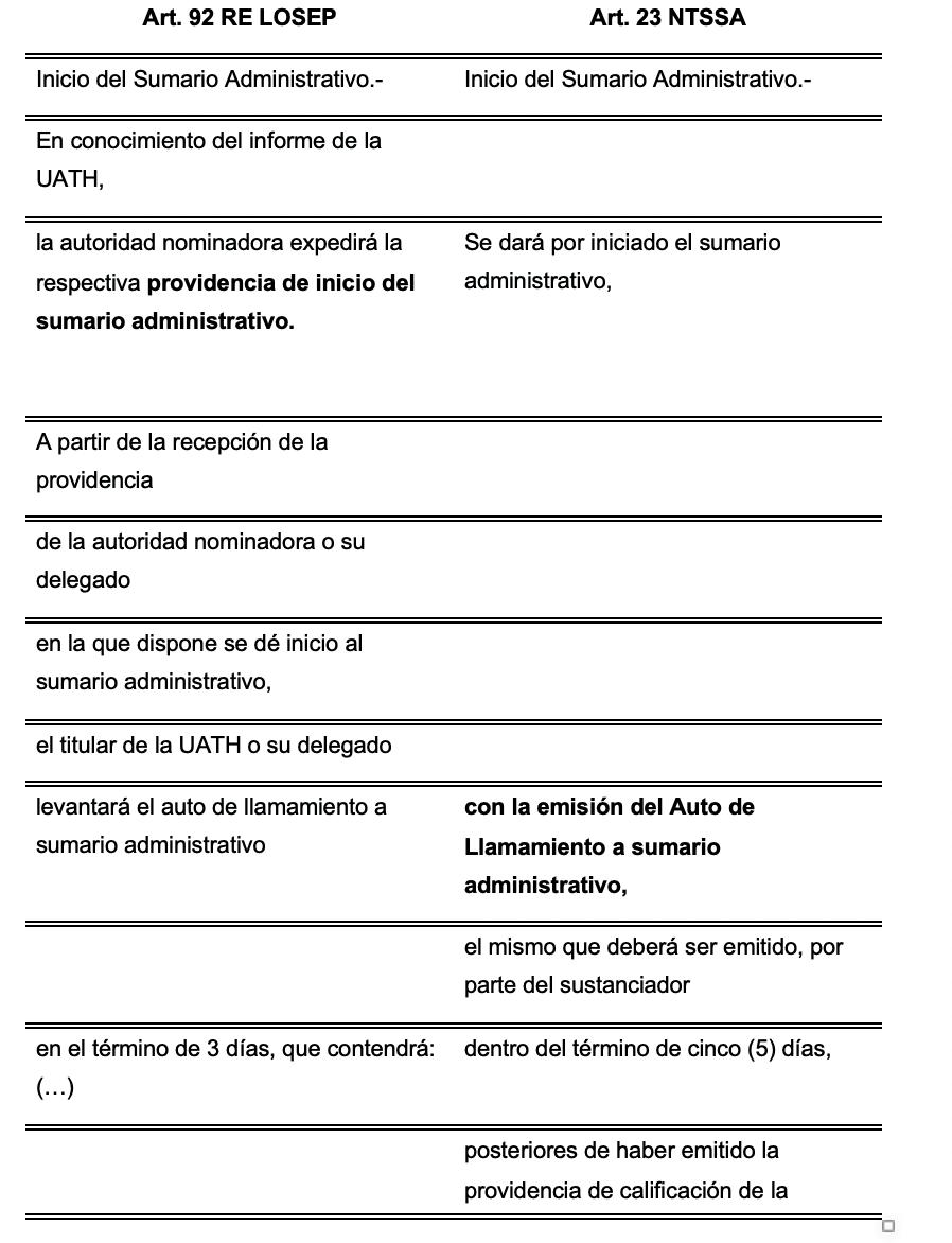 vo con el auto de llamamiento a sumario administrativo, un extracto dice: “1.- De conformidad con el artículo 23 de la Norma Técnica para la Sustanciación de Sumarios Administrativos que fue sustituido mediante reforma del Acuerdo Ministerial Nro. MDT-2019-081 de abril de 2019 publicado en el Registro Oficial Suplemento Nro. 463, se dispone lo siguiente: (…)”