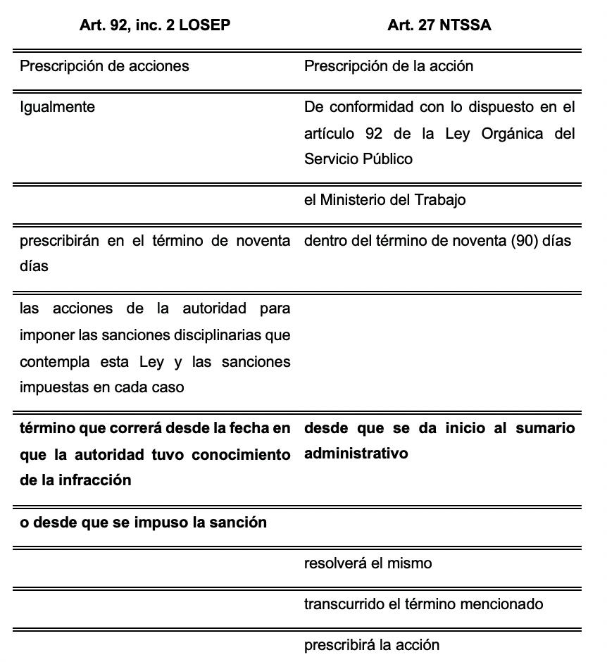 La acción sancionadora del Ministerio del Trabajo ya había prescrito cuando se convocó a la audiencia de sumario administrativo. Arribamos a esta conclusión aplicando irrestrictamente, lo preceptuado en el artículo 425 de la CRE sobre cómo se deben resolver los conflictos entre normas de distintas jerarquías. Ergo empleamos lo tipificado en los artículos 92 de la LOSEP y 90 del Reglamento General a la LOSEP para contabilizar el término de 90 días.