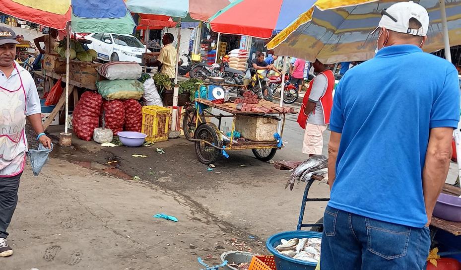 puestos al sol, al polvo y al smog de los vehículos que a diario transitan por el lugar, personas comprando los productos es la historia que se vive cada día en los alrededores del mercado municipal.