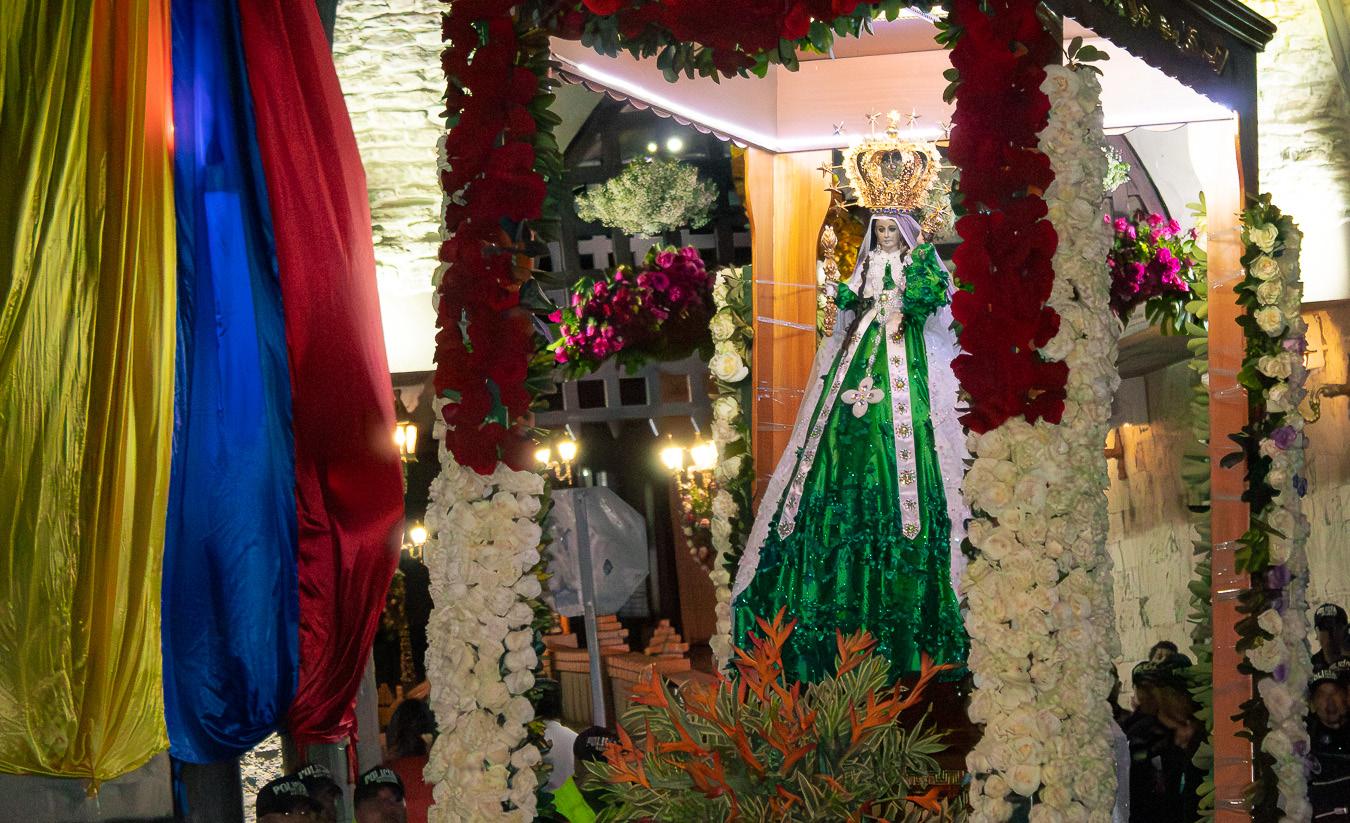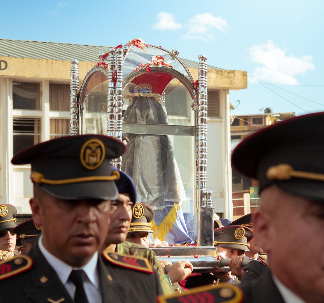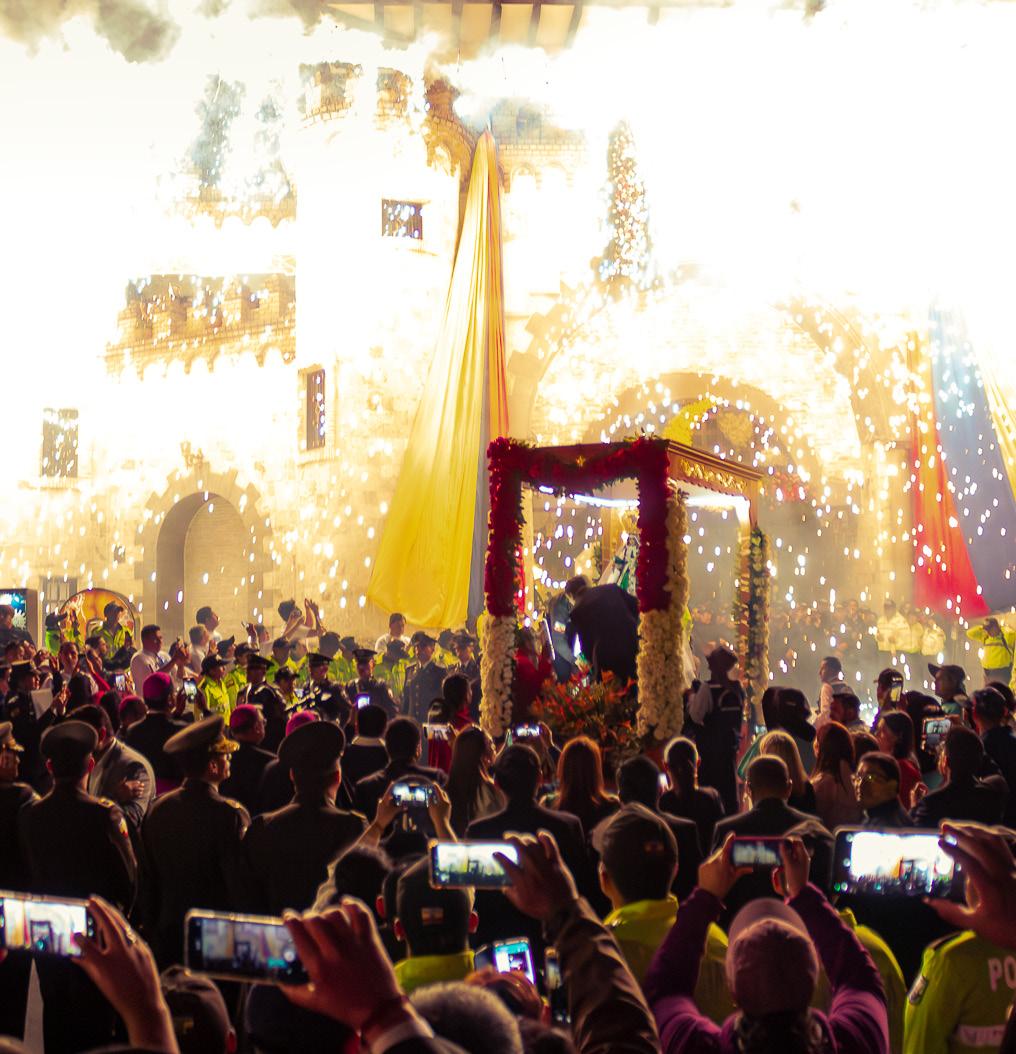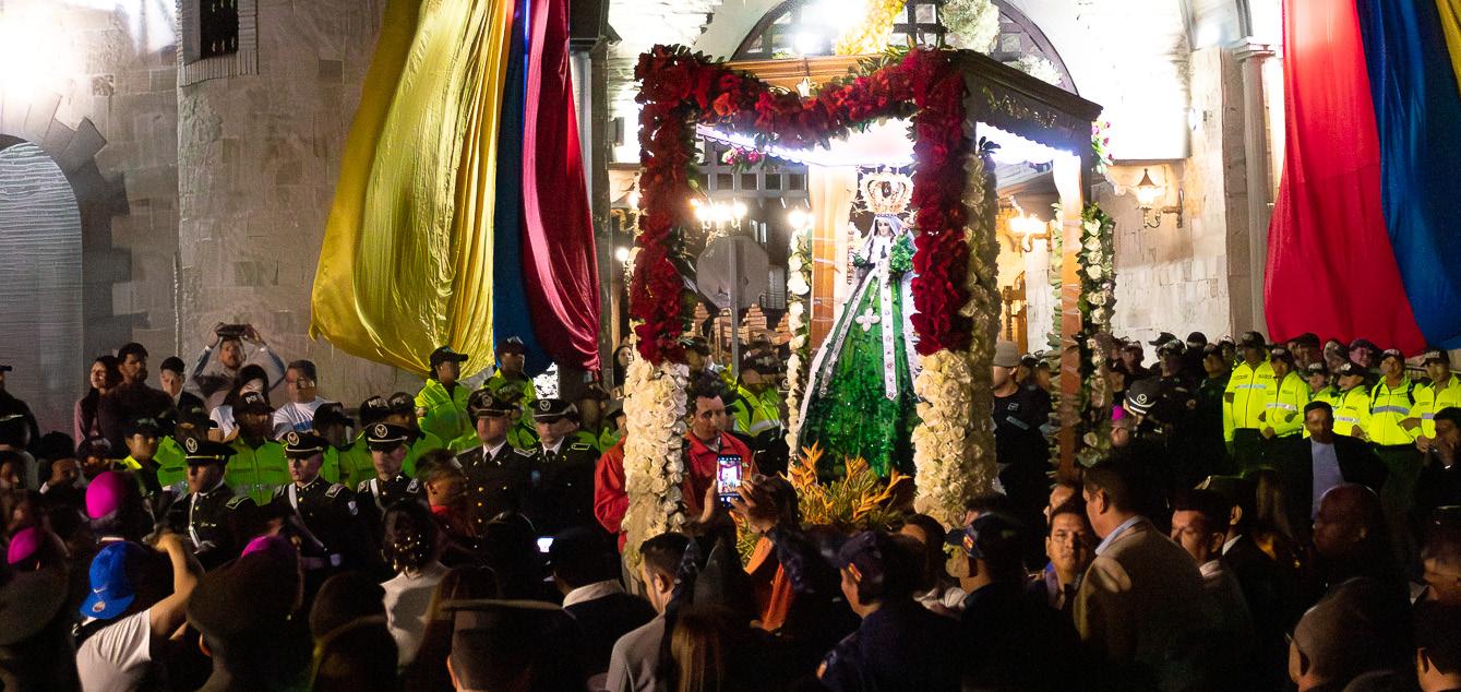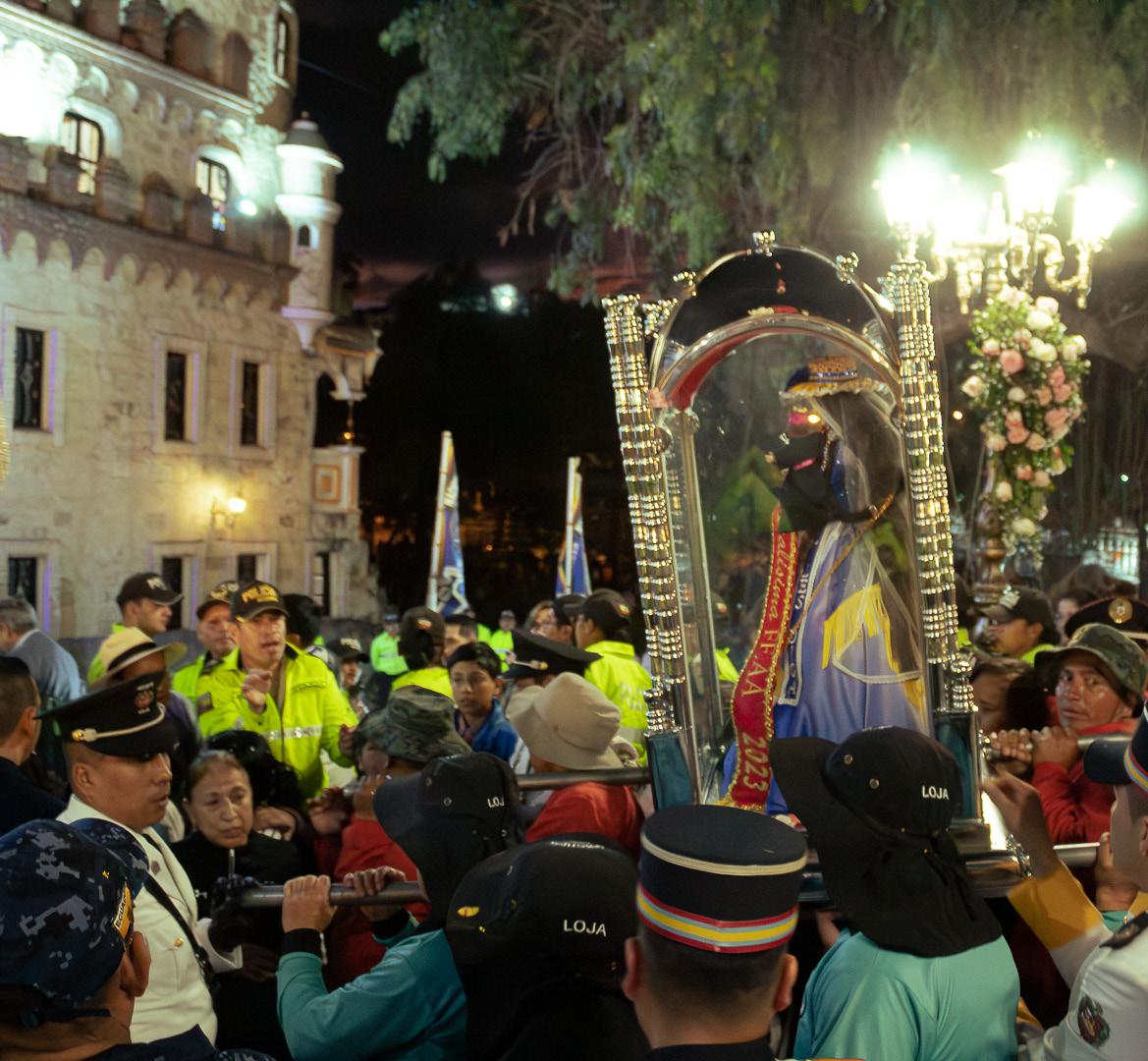 Terminada la misa, el personal militar entregó la imagen a los agentes de Control Municipal , quienes se encargaron de llevarla hacia la Puerta de la Ciudad, donde se realizó el cambio de vestimenta para dirigirse hacia la Iglesia La Catedral Franco Quezada, alcalde de la ciudad, oficializó la entrega al general Fausto Salinas , comandante general de la Policía Nacional, para efectuar el traslado con los honores respectivos y juego de luces.