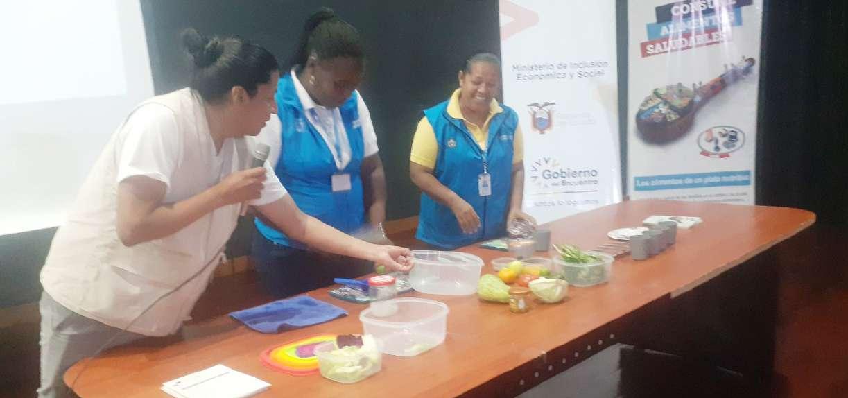El Chef Alfredo Guamani de la Fundación Heifer ex plicó la forma de preparar platillos sanos y saludables con un equilibro entre car bohidratos, proteínas y gra sas naturales. Con apoyo de 5 voluntarias preparó una ensalada, destacando que se debe hacer sin uñas pin tadas, con buen lavado de manos y evitando el peligro de las tablas de picar donde se concentran bacterias. Los peligros de contaminación con los lengüetazos al pro bar los alimentos.