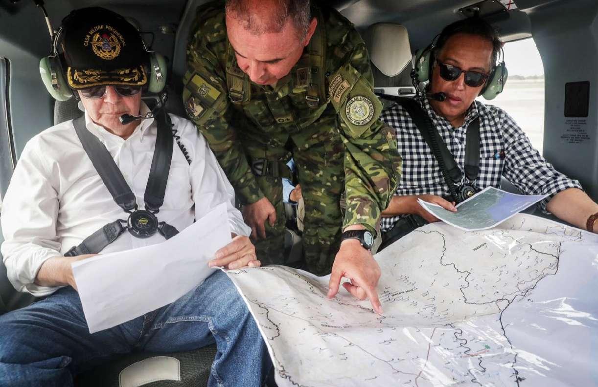 Un sobrevuelo mostró la minería ilegal Previo a todos los anuncios de inyección de capital y compromisos gubernamen tales, el Presidente realizó un sobrevuelo en San Lo renzo, desde Juan Montalvo hasta el pie del Río Mataje y pudo observar 5 campa mentos de minería ilegal, acompañado de elementos de la Fuerza Aérea Ecuato riana. El mandatario culpa al crimen organizado y ca lifica de inaceptables estos campamentos.