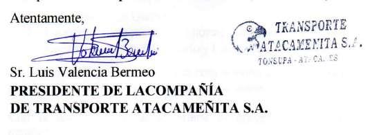 Con esta convocatoria, se invita especialmente, al Sr. Comisario de la Compañía de Transporte Atacameñita S.A., Sr. Carlos Quinteros.
