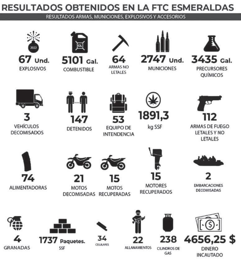 El pasado viernes 18 se hizo pública el informe de resulta dos de lo operativos realizados en la provincia de Esmeraldas desde junio a noviembre del presente año, en el cual se in forma que se movilizaron 1613 efectivos y se ejecutaron 8893 operaciones militares, el re sultado de armas, municiones explosivos y accesorios en este rango de tiempo fue: 67 unidades de explosivos, 5101 galones de combustible, 64 armas no letales, 2747 municiones, 3435 galones de precursores químicos, 3 vehículos decomisados, 147 personas detenidas, 53 equi pos de intendencia, 1891,3 kg de Sustancias sujetas a fisca lización, 112 armas de fuego letales y no letales, 74 alimen tadoras, 21 motos decomisa das , 15 motos recuperadas, 15 motores de embarcaciones recuperados, 2 embarcacio nes decomisadas, 4 grana das, 1737 paquetes de sustan cias sujetas a fiscalización, 22 allanamientos, 238 cilindro de gas y una suma de 4656,25 dólares incautados.