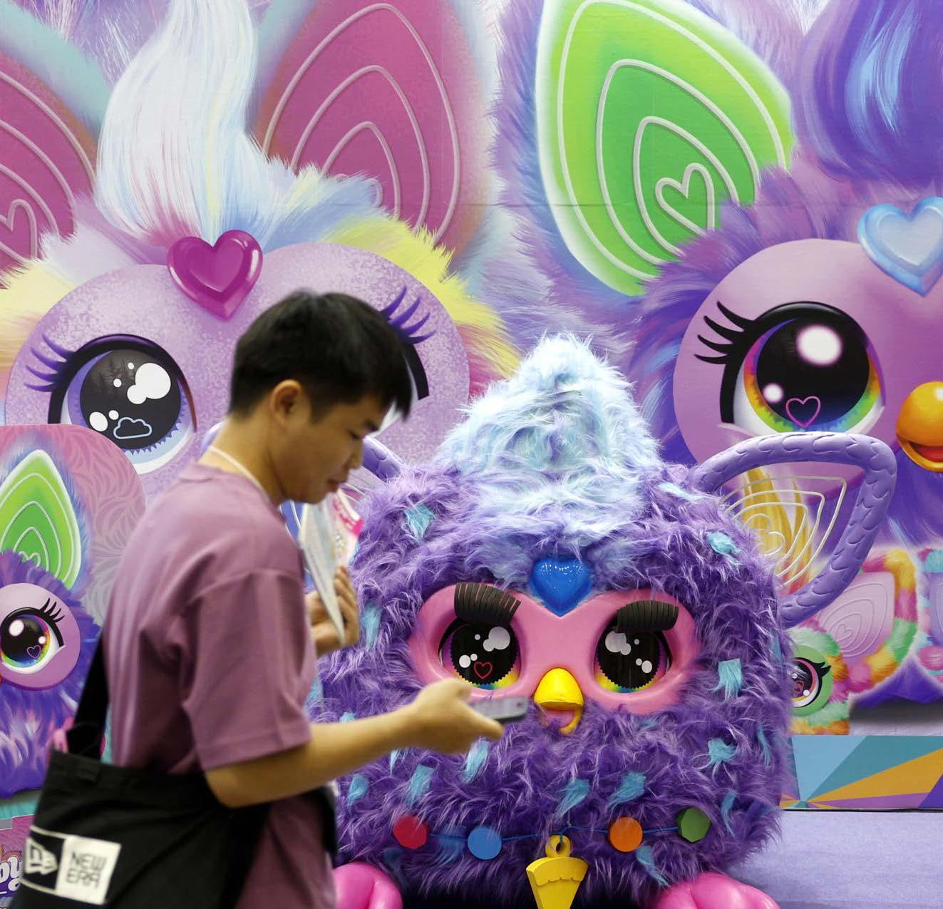 Un joven pasa junto al muñeco Furby, en el stand de Hasbro, durante la Exposición Internacional del Juguete de Tokio 2024, que abrirá sus puertas al público este 31 de agosto en el centro de convenciones Tokyo Big Sight. En la cita se exhibirán 35.000 juguetes de 192 empresas japonesas y extranjeras. EFE