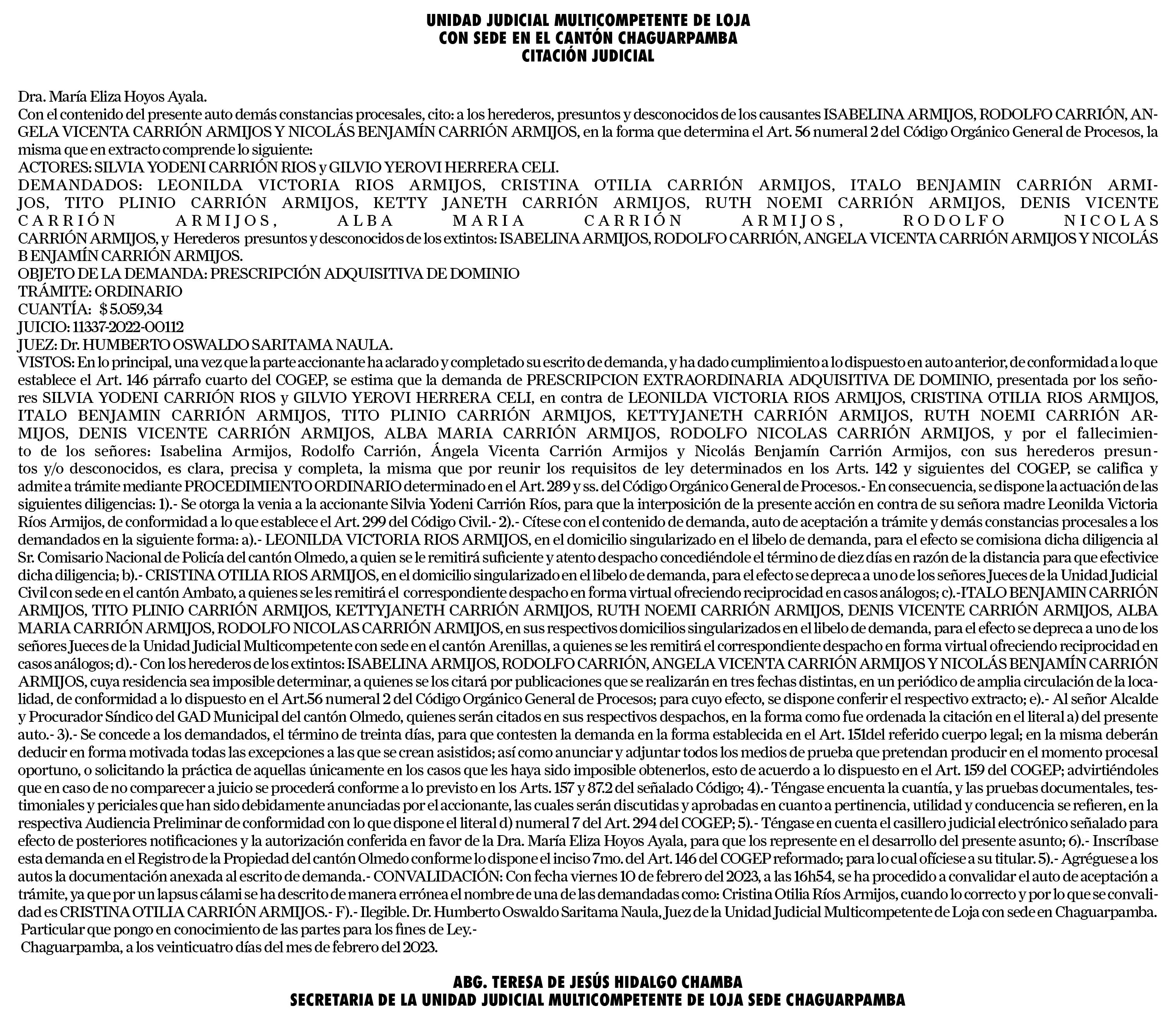 HENRY ADRIAN, en el domicilio señalado en la demanda, en la forma que señalan los Arts. 53 y 63 del Código Orgánico General de Procesos, para la CITACIÓN Se COMISIONA al Teniente Político de la parroquia Chicaña. De conformidad con lo dispuesto en el Art. 4, numeral 4.2 de la Resolución Nro. 061-2020 de fecha 10 de junio del 2020, a través de la cual el Pleno del Consejo de la Judicatura resolvió: EXPEDIR EL REGLAMENTO PARA LA GESTIÓN DE CITACIONES JUDICIALES, se dispone que la parte accionante en el término de tres días, obtenga tres ejemplares, para la elaboración de las boletas de citaciones. “Para ello, la o el actor, en el término de tres (3) días, deberá entregar al archivo de la dependencia judicial, las copias necesarias para la gestión de citación, adjunto al “formulario de entrega de copias para citación. En aplicación de los artículos 355 y 333, numeral 3 del COGEP, se concede el término de quince (15) días para que los demandados propongan alguna de las excepciones taxativas del artículo 353 del código citado, bajo prevención que de no hacerlo se pronunciará inmediatamente sentencia y esa resolución no será susceptible de recurso alguno, en cumplimiento al artículo 352 del COGEP. Tómese en cuenta el correo electrónico señalado. Actué la Dra. Salomé Quizhpe en calidad de secretaria de esta Unidad Judicial. - NOTIFÍQUESE Y CÚMPLASE.