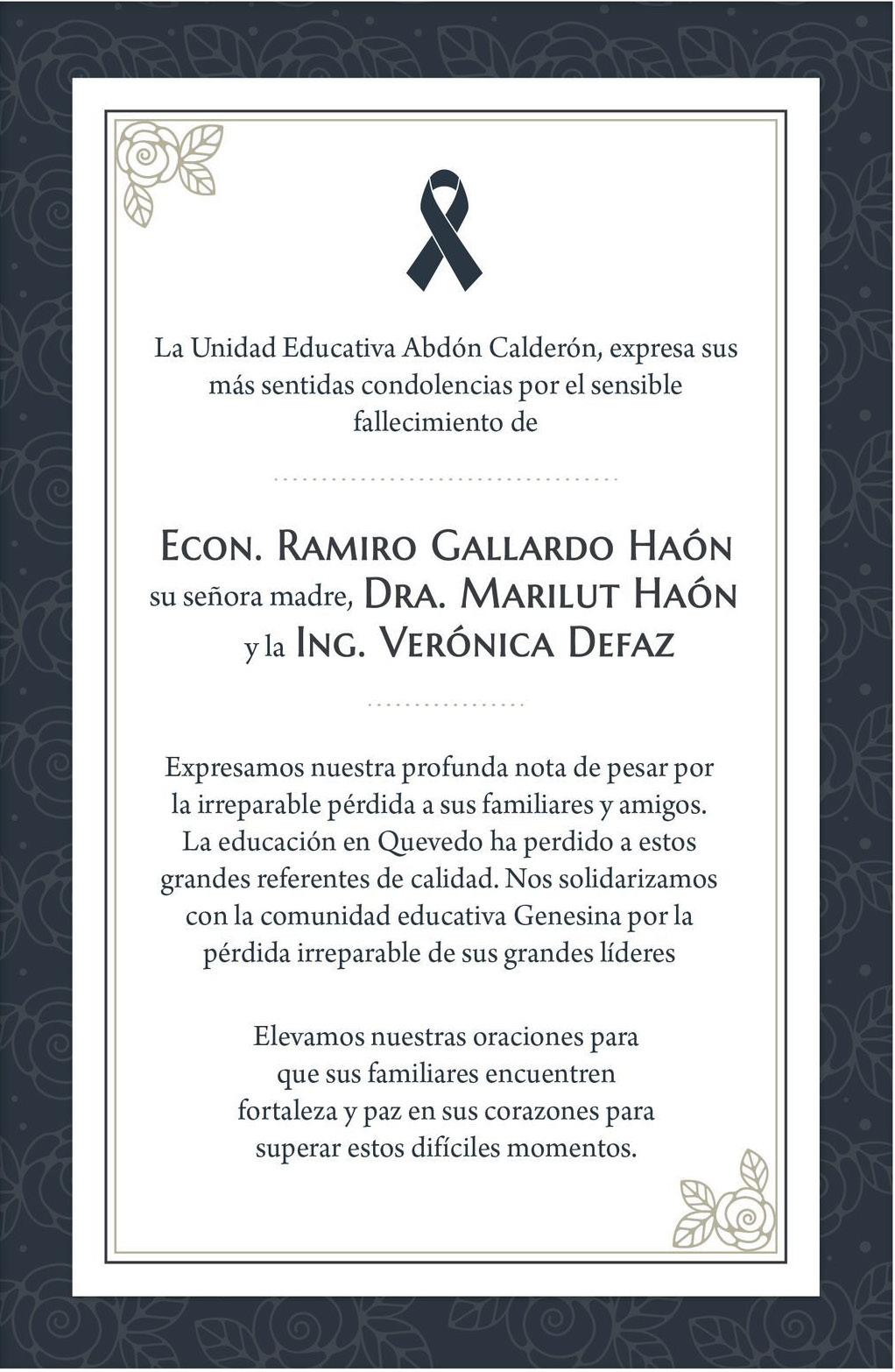 Los fallecidos fue ron identificados como: Mari Lut Haón, madre de Ramiro Gallardo, rec tor de la Unidad Educa tiva Génesis, quien tam bién murió, y Verónica Defaz (nuera). Se presume eran ocho las personas que