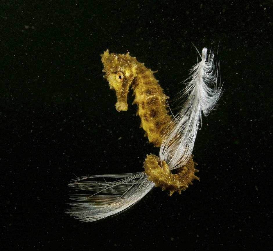 El español Francisco Javier Murcia (Cartagena, 1974) fue el ganador en los Siena Awards de Fotografía de la categoría de Vida Submarina con “Volando voy, volando vengo”. En la fotografía se puede ver a un joven caballito de mar “abrazando” una pluma de gaviota en el Mar Menor. La imagen es “un homenaje a los jóvenes caballitos de mar que, en su primera etapa de vida, aprenden a moverse aferrándose con sus colas a cualquier objeto flotante”. EFE