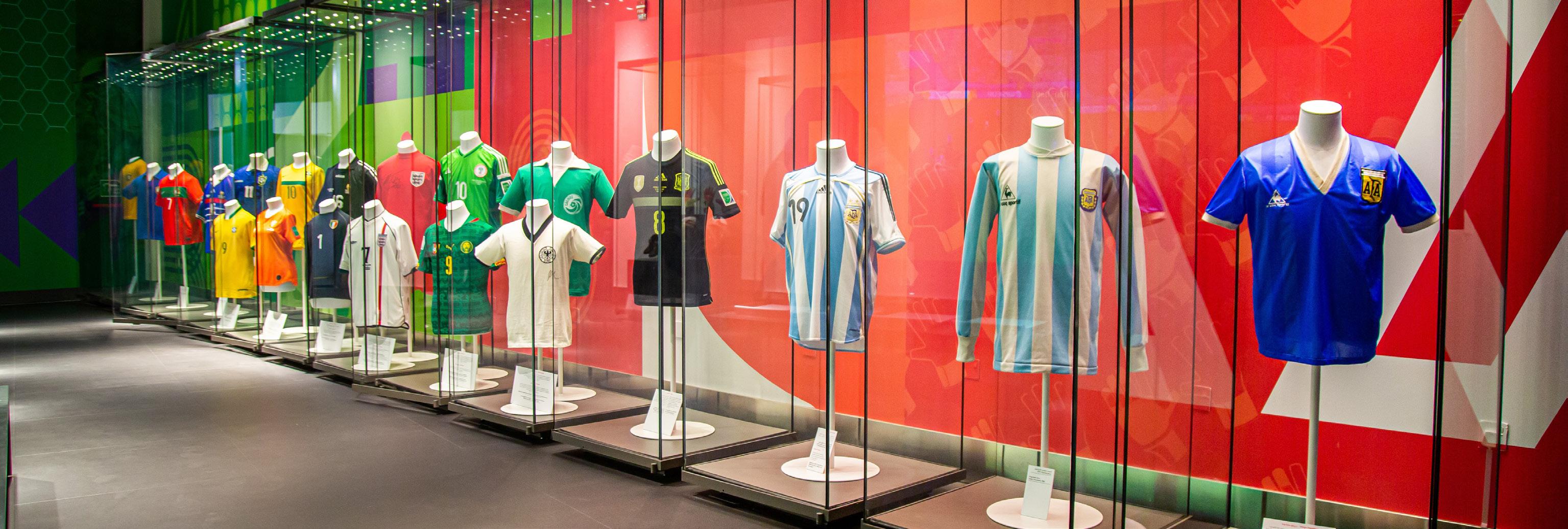 ° La muestra se inspira en la estructura de un partido de fútbol, con dos tiempos: el primero se denomina ‘Fútbol para todos, todos para el fútbol’, que examina el llamativo global del fútbol. El segundo tiempo es ‘El camino a Doha’, que recorre desde los primeros partidos de la Copa Mundial Masculina de la FIFA 1930 hasta la final del torneo de este año que tendrá lugar en el Estadio Lusail el 18 de diciembre de 2022.