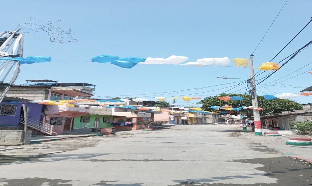 En otro popular tramo de la ciudad, Barrio 5 de Junio localizado en la ribera del río Esmeraldas, a propósito de la Navidad, los moradores planificaron jornadas de lim pieza y embellecimiento co munitario por medio del arte, con el objetivo de fomentar conciencia ciudadana a fin de mantener limpio y ordenado el sector bajo el principio de organización barrial y activa participación local.