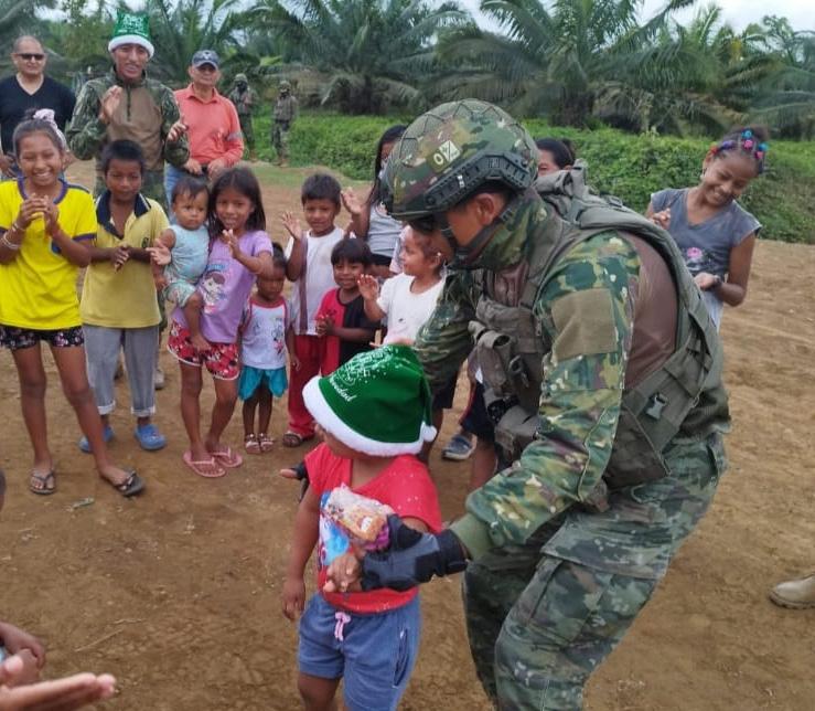 En San Lorenzo (Esmeraldas), integrantes del Batallón de Operaciones Especiales 47 IWIAS del Ejército agasajaron a niños de bajos recursos económicos en Navidad, con juguetes, caramelos y entretenidos juegos.