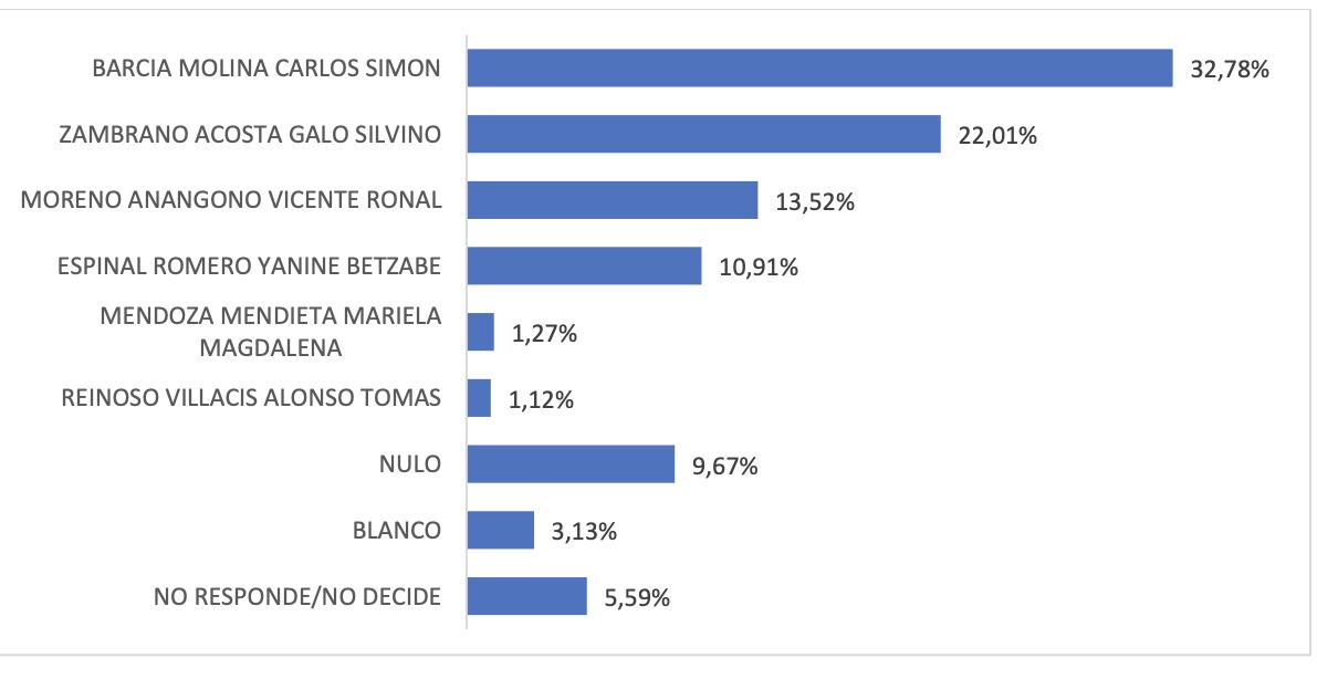 Molina Carlos Simón con 32.78%, en segundo lugar Zambrano Acosta Galo Silvino con un 22.01% y en tercer lugar a Moreno Anangono Vicente Ronal. La encuesta es firmada por Luis Esteban Lapo Vásquez