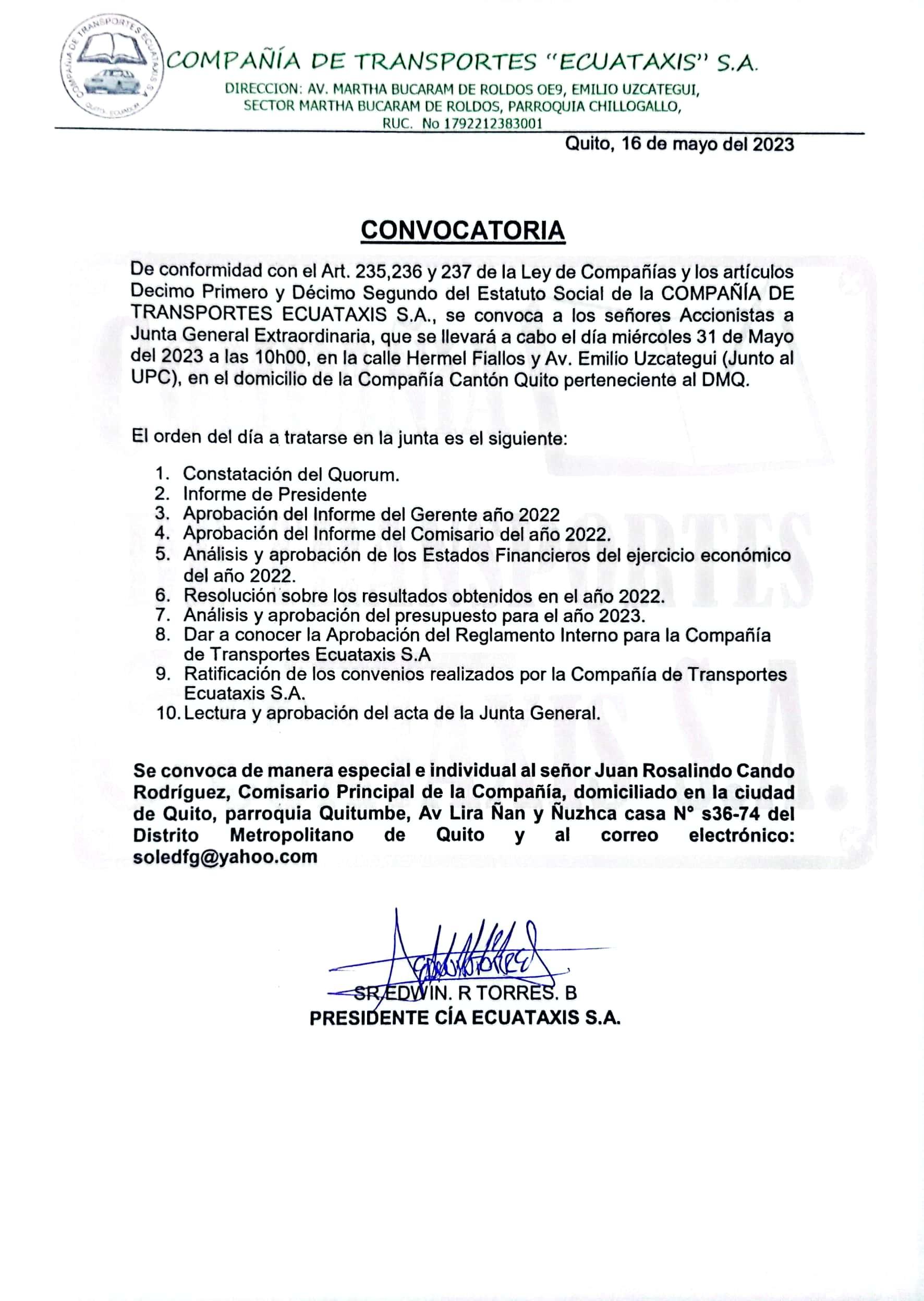 De conformidad con lo establecido en la Ley de Compañías y Estatutos de la Empresa, se convoca a los señores accionistas y a la señora María Tiban, en su calidad de comisario principal, a la Junta General Extraordinaria de Accionistas que se realizará el día martes 30 de mayo del 2023 a las 09:00 a.m. en la Parroquia San Isidro el Inca Arquidiócesis de Quito ubicada en los Olivos 102 y Nogales sector el Inca en la Ciudad de Quito, Provincia de Pichincha, para tratar los siguientes puntos del orden del día.