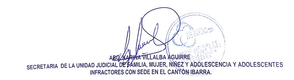 JUEZ DE LA CAUSA: ABG. BENITEZ TELLES ALZIRA BEATRIZ JUEZA DE LA UNIDAD JUDICIAL DE FAMILIA, MUJER, NIÑEZ Y ADOLESCENCIA Y ADOLESCENTES INFRACTORES CON SEDE EN EL CANTON IBARRA, PROVINCIA DE IMBABURA. SECRETARIA: AB. KARINA VILLALBA AGUIRRE.