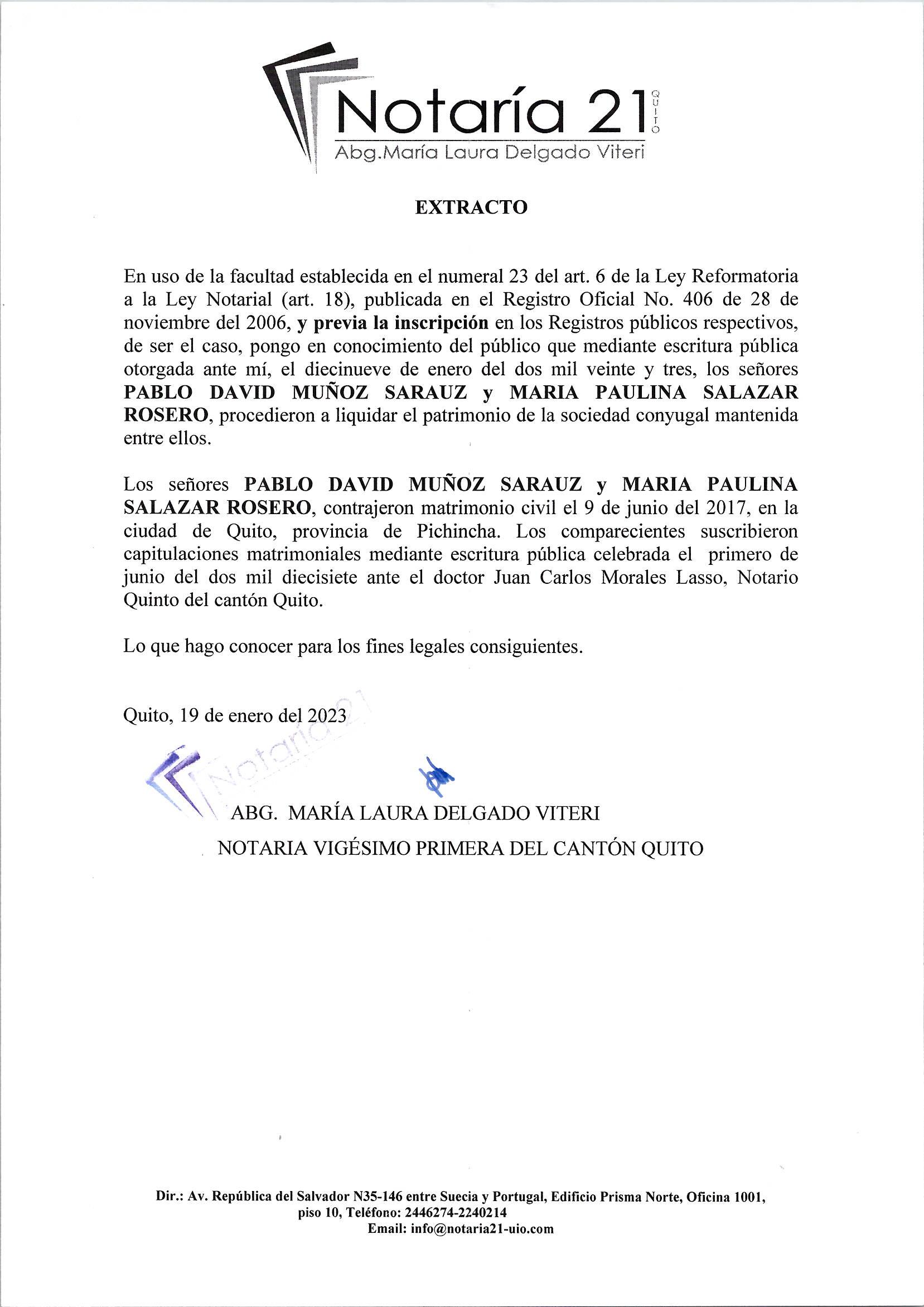 De conformidad con el artículo 18 numeral 23 de la Ley Notarial, para los fines legales consiguientes, en mi calidad de Notaria Octogésima Quinta del Cantón Quito, DOY AVISO y hago conocer, que el día 30 de diciembre del 2022 el señor CARLOS TEODORO CABRERA ARAUJO y la señora LILA JEANETH otorgaron en esta Notaría la escritura pública N° que contiene la liquidación de la sociedad conyugal.- Las adjudicaciones del patrimonio, se encuentran detalladas en el texto de la referida escritura pública.