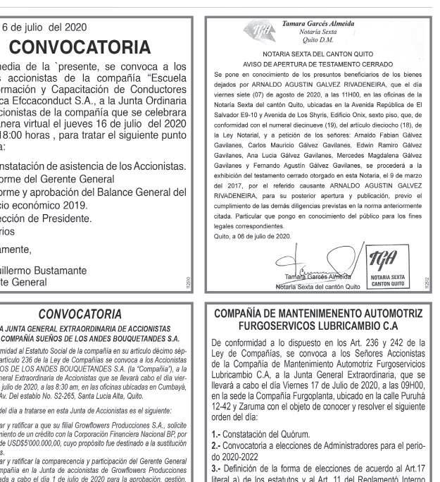De conformidad con la Ley de Compañías, el Reglamento sobre Juntas Generales y el Estatuto Social de la Compañía, se convoca a los Accionistas y Comisario de ÓMNIBUS BB TRANSPORTES S.A. a la Junta General Extraordinaria de Accionistas que se efectuará de medios telemáticos por la plataforma Microsoft Teams, el día jueves 24 de agosto de 15h00 horas