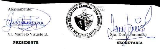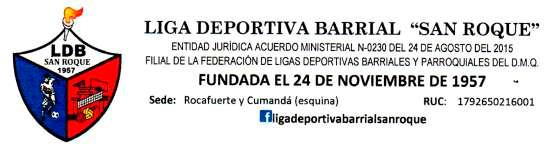 Por medio de la presente, amparado en lo que dispone los artículos 15-16 y 17 del Reglamento sustitutivo al reglamento general de la ley del deporte, educación física y recreación, el Art. 22 del Estatuto de nuestra institución CONVOCO a la Asamblea General de Elecciones de Liga Deportiva Barrial San Roque en la cual se elegirá al Directorio de la Institución para el periodo 2023-2027, a realizarse el día sábado 24 de junio del año en curso a las 16:00 horas en la sede de nuestra Institución ubicada en la calle 24 de mayo y Cumandá (interior del complejo deportivo), para lo cual deberán realizar la acreditación obligatoria de su presidente y un delegado, adjuntado copias de cédula y papeleta de votación actualizada a color, copia de los estatutos y registro de los nombramientos, con el siguiente orden del día: